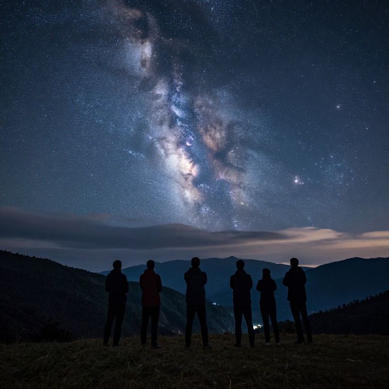Stargazers gather in a tranquil mountainous landscape, their silhouettes framed against a mesmerizing night sky where the Milky Way cascades through clouds, creating a celestial spectacle that inspires awe and wonder.