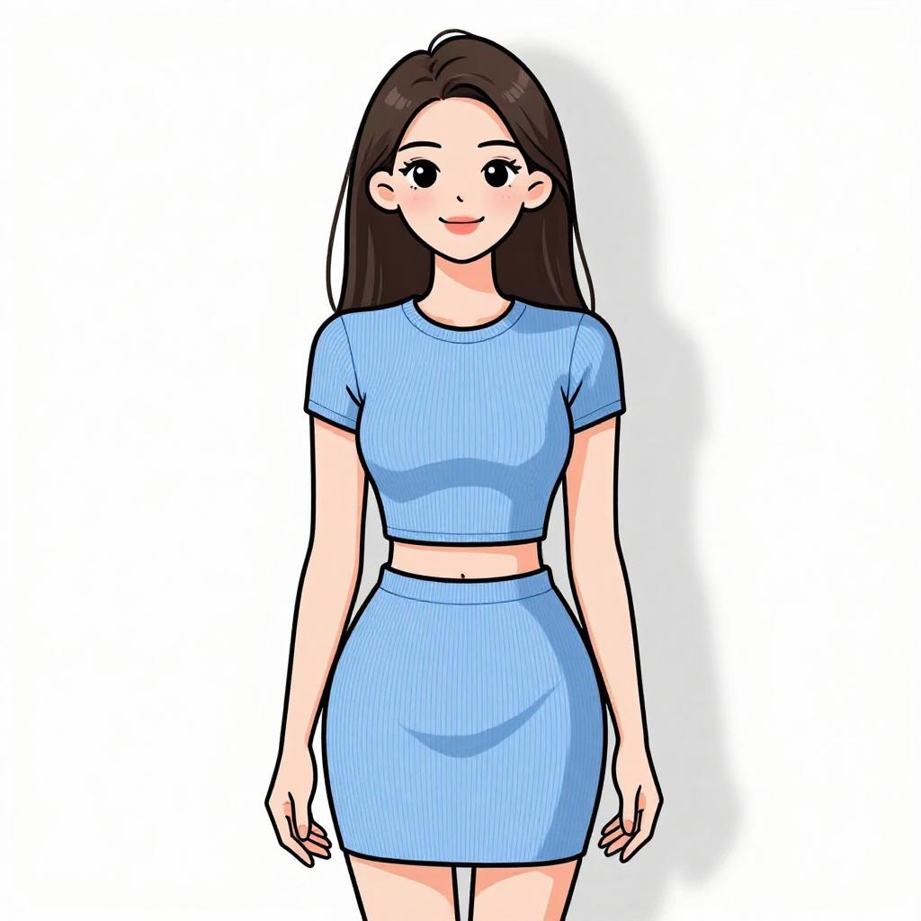 Woman with pretty face and pretty hair. smiling Woman, contemporary chic, coordinating knit ensemble in pastel pink, cropped tank top with square neckline and textured ribbing, matching high-waist mini skirt with a ribbed pattern, long-sleeve cardigan with puffed shoulders left open, minimal makeup, straight long hair, studio background with a seamless white surface. --sref 1467
