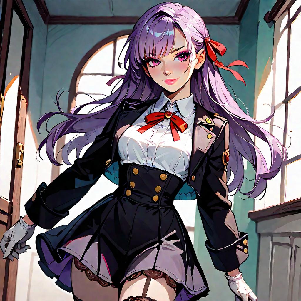 Illustration of an anime-style girl with long purple hair and bright purple eyes, wearing a black high-waist skirt, white shirt with a red neck ribbon, white gloves, black thighhighs with lace trim, and a black coat with a popped collar. She is smiling indoors standing in a bright corridor with windows.