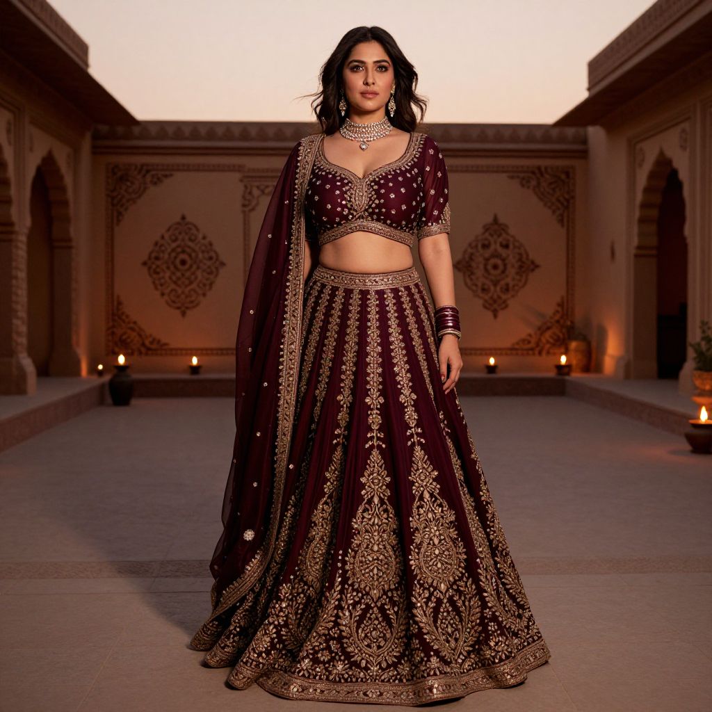 A stunning woman with deep brown eyes and a defined jawline stands in a traditional Indian courtyard at sunset, wearing a striking dark maroon lehenga with intricate gold zari embroidery, the costume flowing in the evening breeze, the backdrop featuring ornate henna designs on walls and flickering oil lamps. The woman has big tits and cute face