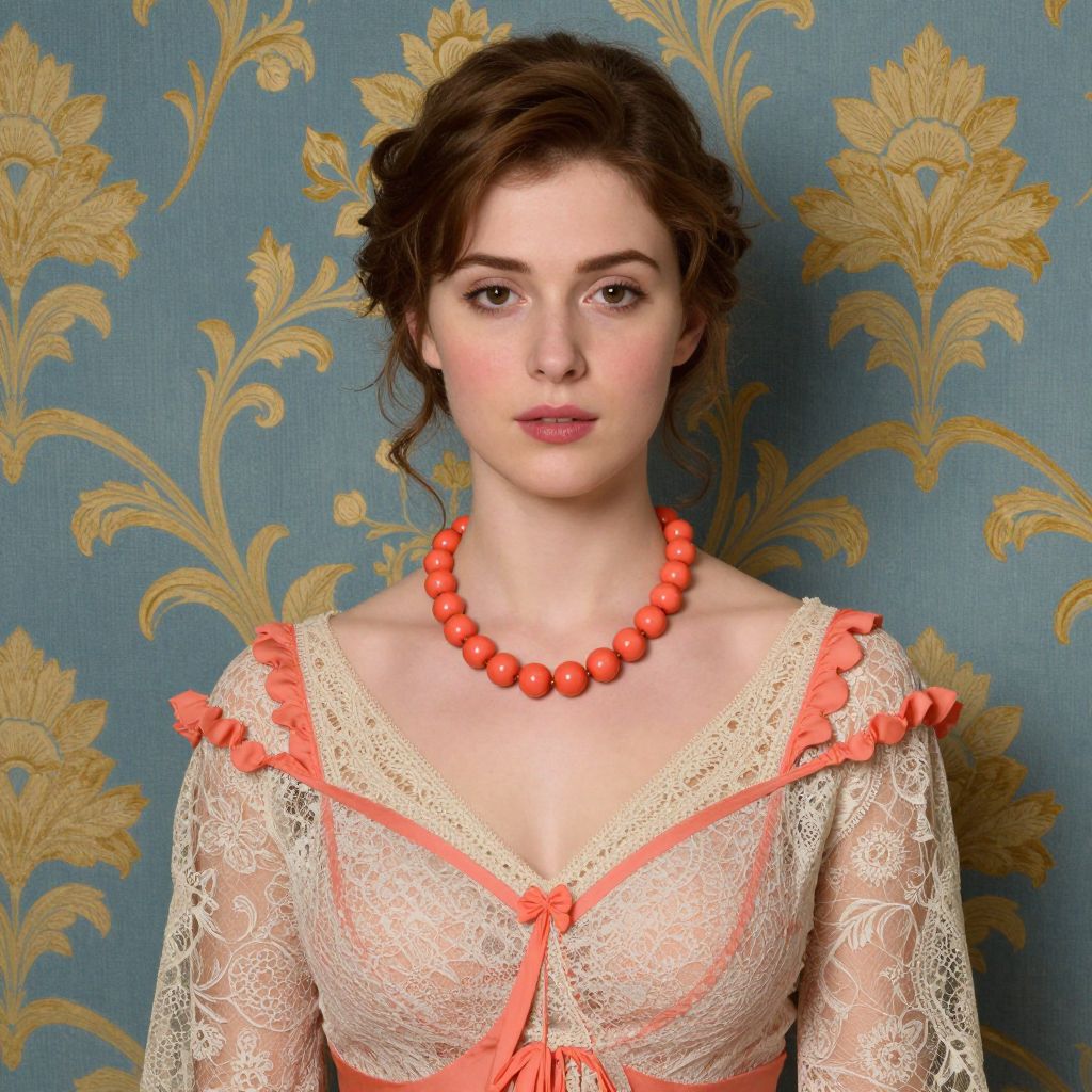 A high-definition digital rendering of a woman adorned in a delicate lace dress featuring coral accents, complemented by a vibrant coral bead necklace, set against a vintage-inspired blue and gold floral wallpaper backdrop, evoking the elegant and luminous style reminiscent of Frederick Carl Frieseke's works.