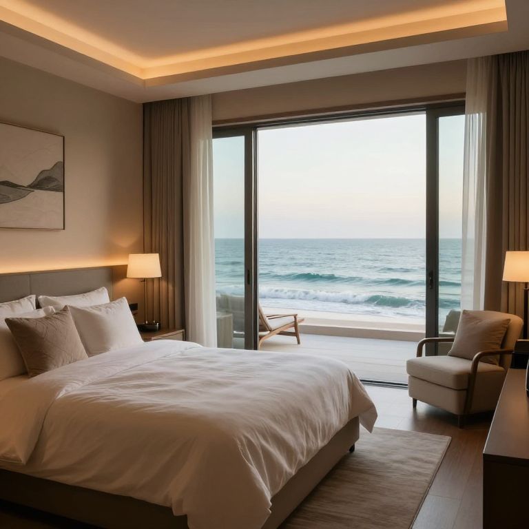 A serene sanctuary of luxury whispers tranquility, where soft lighting, plush textures, and the gentle hum of ocean waves outside invite a retreat into peaceful solitude and introspection.