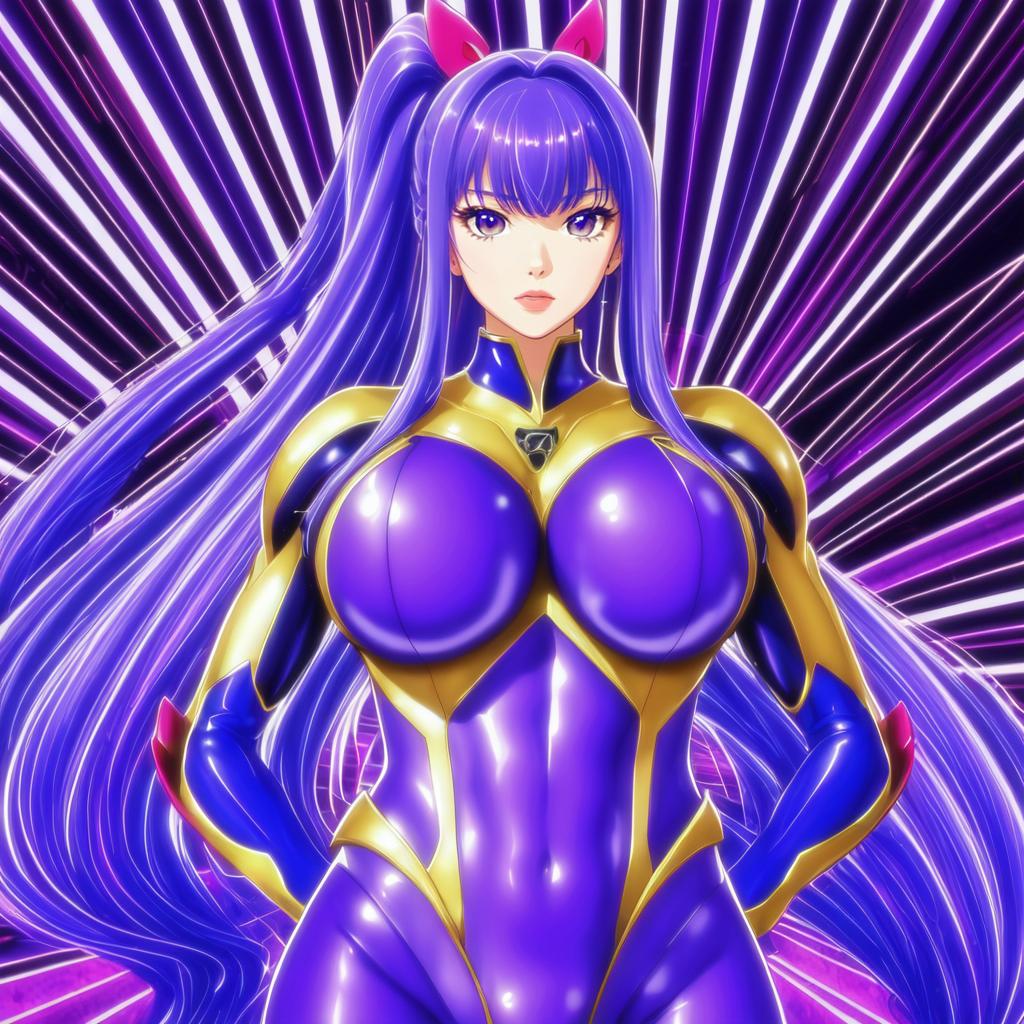 Digital illustration of a female anime character with very long purple hair tied in a high ponytail and purple eyes, wearing a glossy purple and gold futuristic taimanin-style bodysuit with large breasts and cleavage, standing confidently against a dynamic purple striped background.