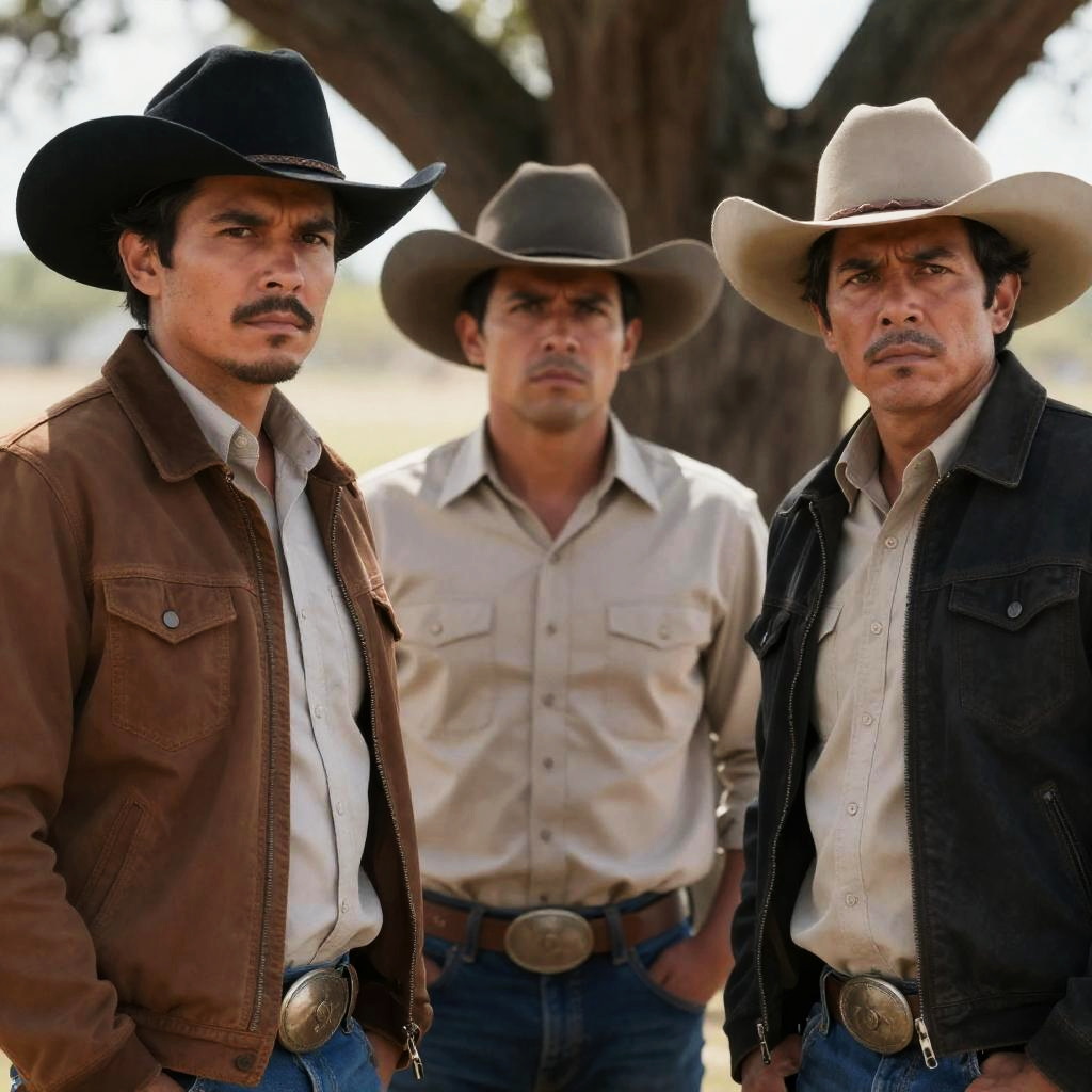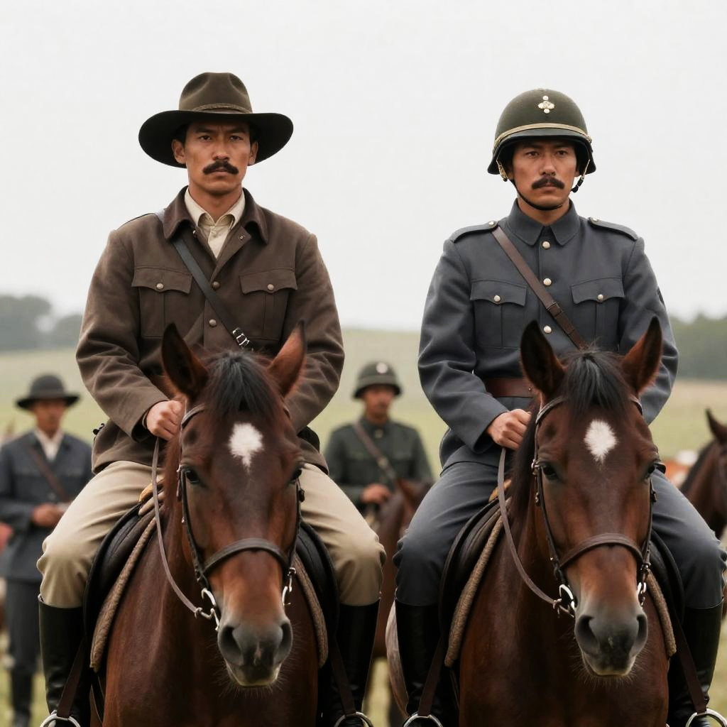 Photograph of two men on horses in a rural setting. The man on the left, with a mustache, wears a wide-brimmed hat and brown jacket. The man on the right, also with a mustache, wears a gray military-style uniform with a helmet. Two other men and a horse are in the background. Both men have serious expressions. The horses' heads are visible in the foreground.