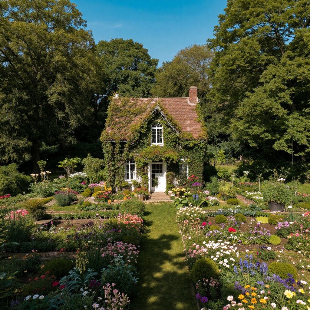 Photograph of a charming, ivy-covered cottage with a red-tiled roof, surrounded by a vibrant, colorful garden with blooming flowers, under