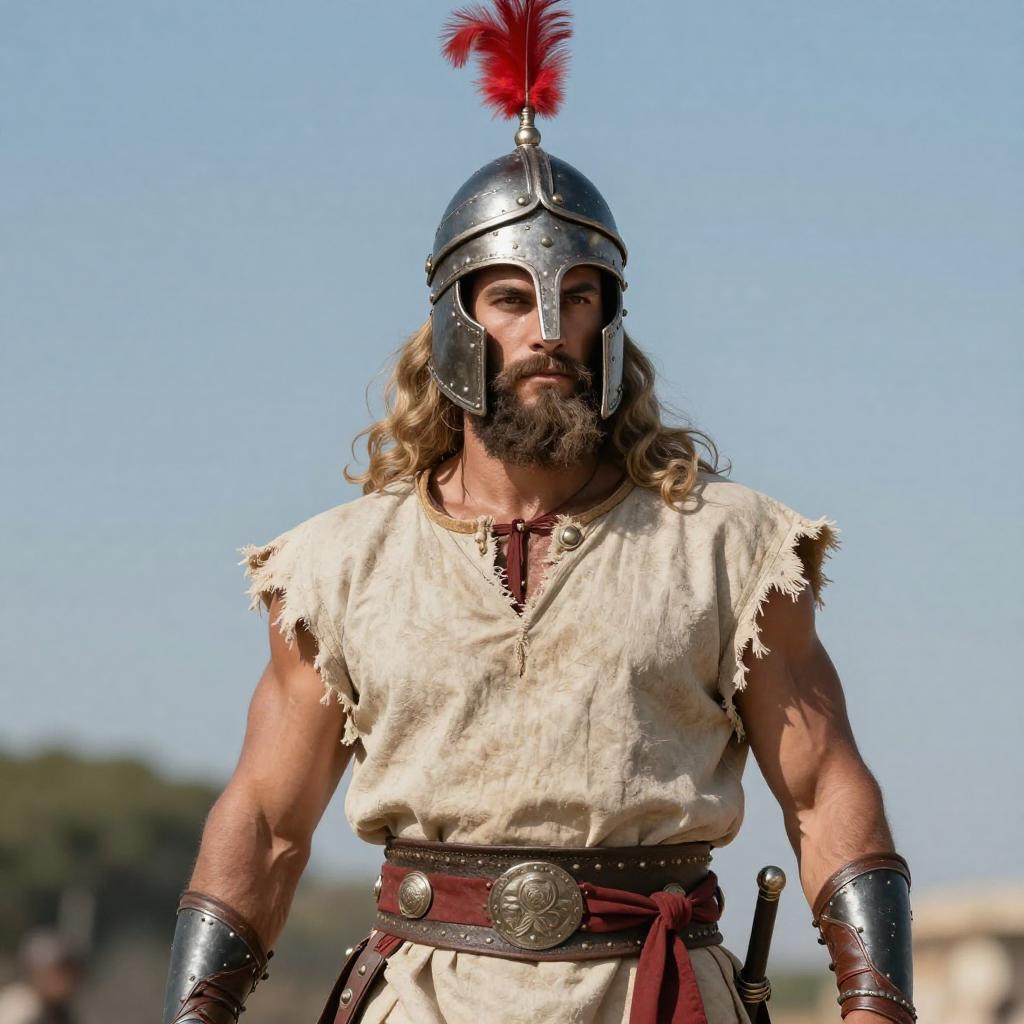 Photograph of a muscular, bearded man with long hair, wearing a silver helmet with a red plume, tattered beige tunic, and