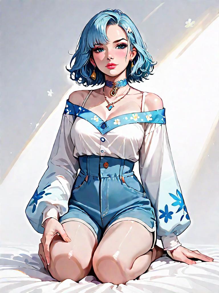 1girl, source_comics, realistic face, full body shot, Woman, casual summer style, black floral print ruffle sleeve top, scoop neckline with ruffle detail, light wash denim shorts, high waist, fitted silhouette, mid-thigh length, simple pendant necklace, white background.
