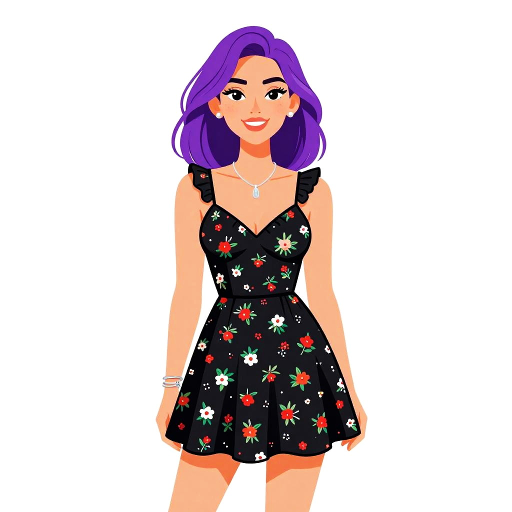 Woman with pretty face and pretty hair. Woman, contemporary bohemian, black mini skater dress with small white polka dots, V-neckline, short flutter sleeves, fitted waist, flared skirt, black wide-brimmed felt hat, white background. --sref 1467