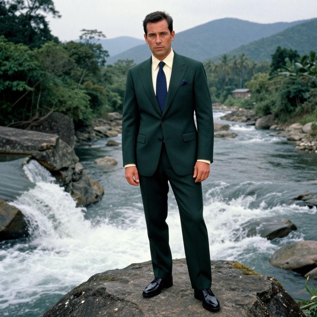 A man, deep forest green suit, ivory dress shirt, textured navy tie, black patent leather shoes, contrasting pocket square, hydroelectric dam cascading water, lush riverbanks, distant mountains, eastman film stock, confident expression Man has masculine face and piercing eyes