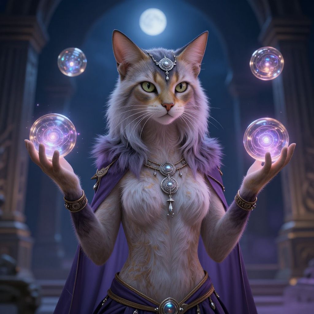Digital artwork of a regal, anthropomorphic cat with green eyes, holding glowing, orb-like magic spheres in a mystical, moonlit temple. W