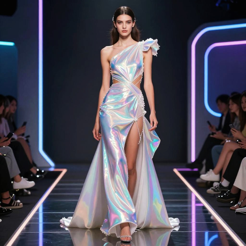 Revealing gown crafted from iridescent fabric, asymmetrical cut with strategic cutouts, futuristic fashion show ambiance, neon lights reflecting on sleek surfaces, avant-garde vibe