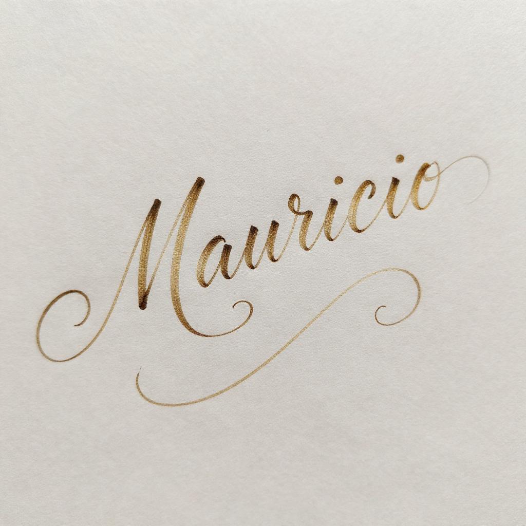 Mauricio in cursive, elegant calligraphy style, flowing script letters with delicate flourishes, gold ink on textured parchment background, soft natural lighting