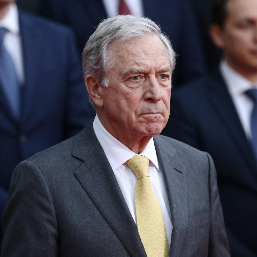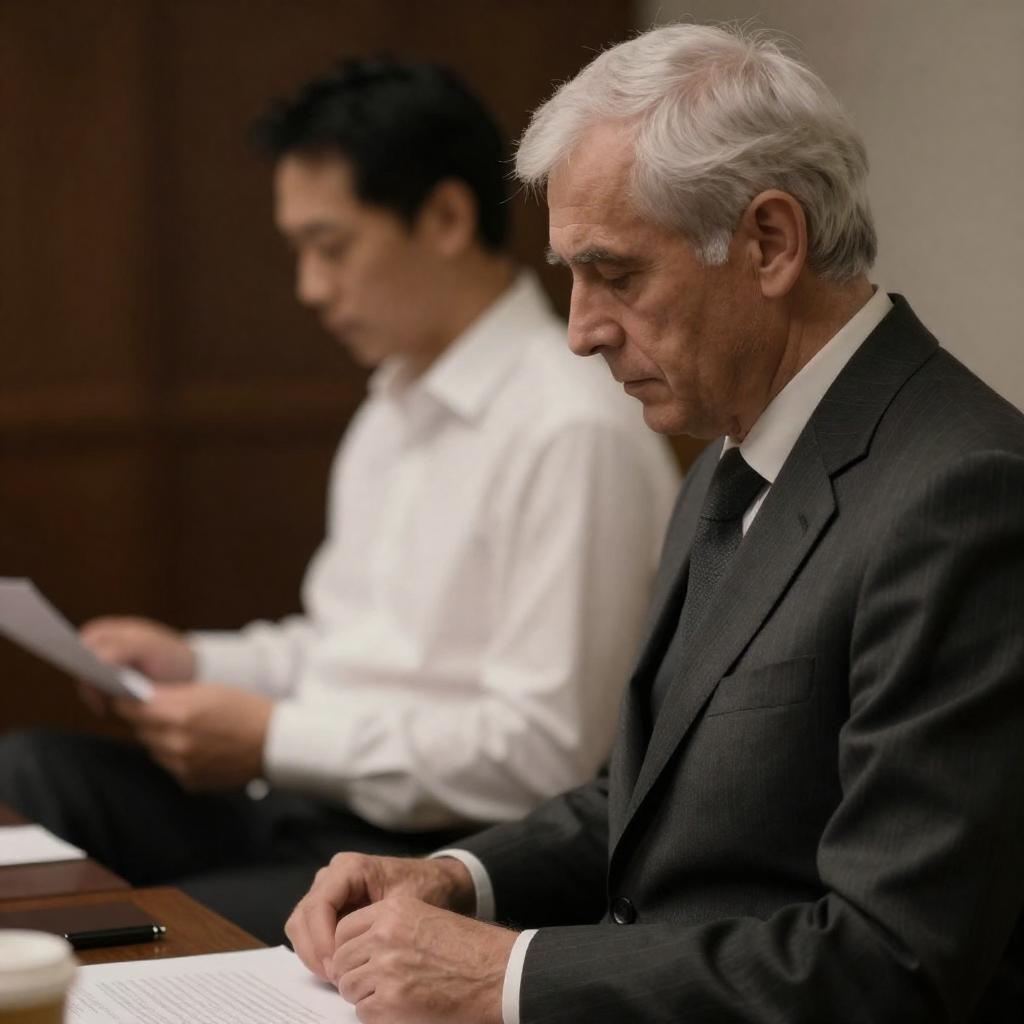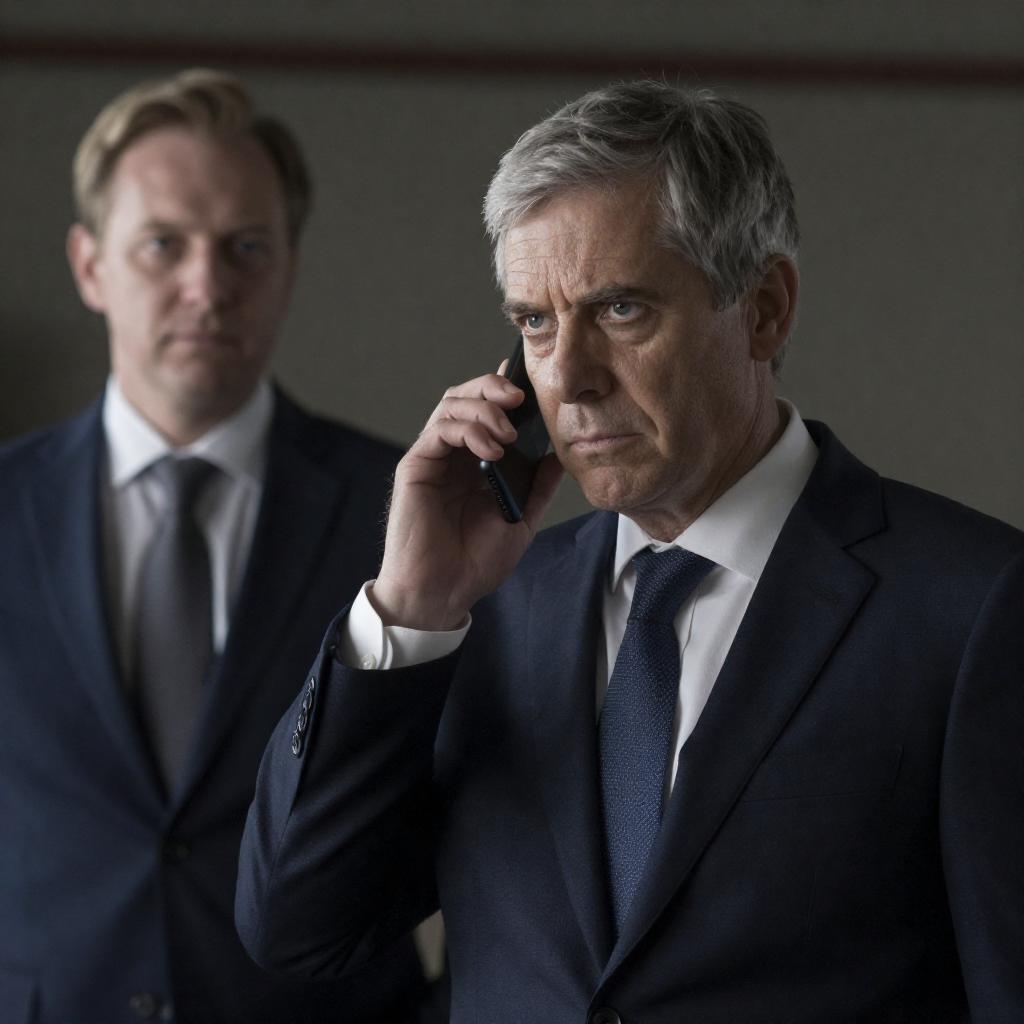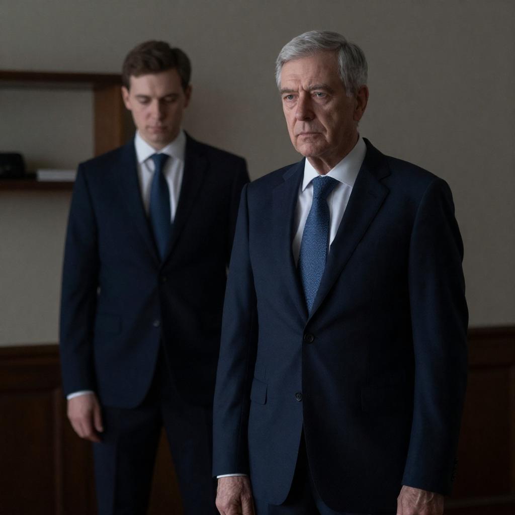 Photograph of two men in a dimly lit room. The older man with gray hair, wearing a dark blue suit and tie, stands in the foreground, looking serious. The younger man with short brown hair, also in a dark suit and tie, stands slightly blurred in the background, looking down. A wooden shelf is visible behind them.