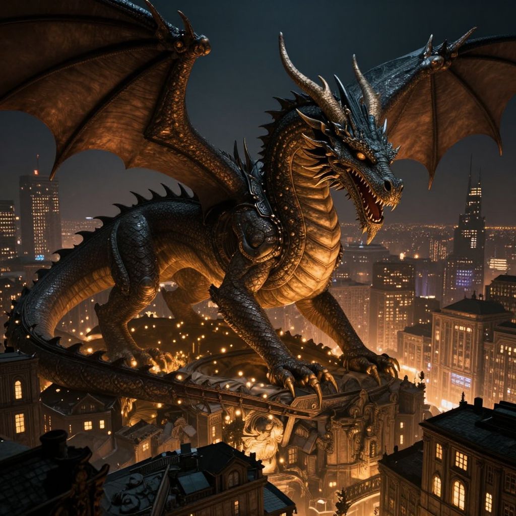A vivid CGI illustration depicts a massive black dragon with glowing orange scales and large, membranous wings perched atop a cityscape at night. The dragon's fierce, open mouth reveals sharp teeth, and its eyes glow menacingly. The city below is illuminated by countless streetlights and building lights, creating a contrast between the dark sky and bright urban lights. Tall skyscrapers and smaller buildings form a dense, detailed cityscape. The dragon's wings are outstretched, casting shadows over the buildings. The overall scene has a dramatic, epic feel, with a focus on the dragon's imposing presence and the city's illuminated, yet vulnerable, layout.