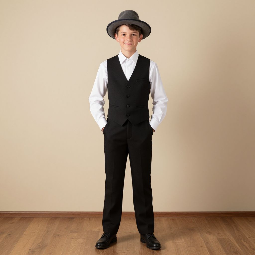 Professional circus costume, 1boy, male focus, solo, hands in pockets, hat, bowtie, bow, red pants, simple background, looking at viewer, star (symbol), grey background, pants, red headwear