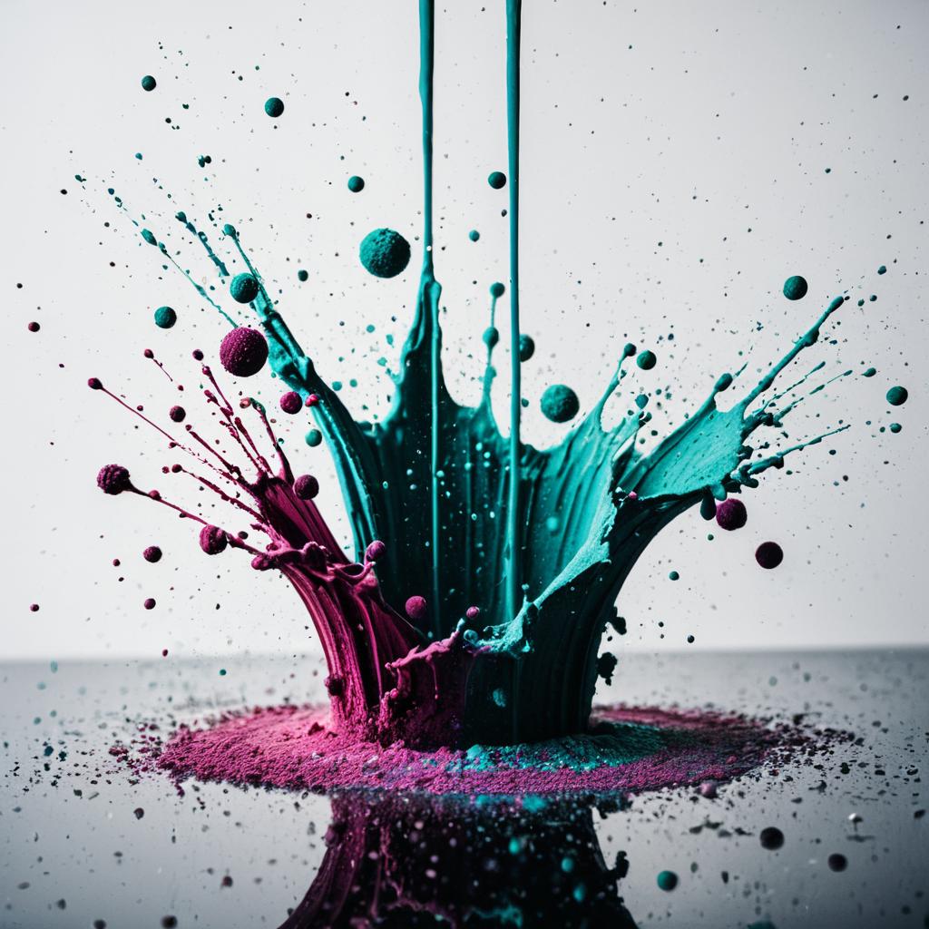 The image captures a foam waves breaking on a sandy shore. The suspended droplets and the smooth interplay of light and dark hues create a visually striking scene that portrays the elegant flow and contrast between the two liquids.