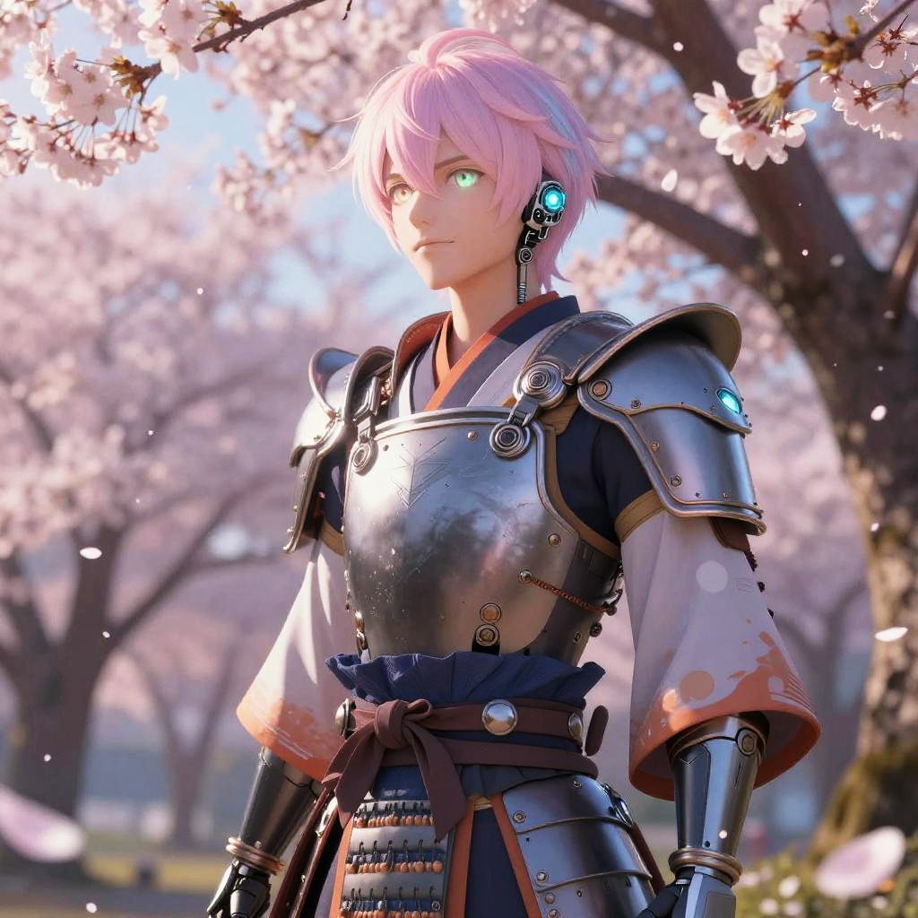 Pink anime boys with vibrant pastel hair and expressive eyes, set in a futuristic cityscape at sunset, detailed anime style, soft glowing neon lights, dynamic poses, cyberpunk fashion, intricate background with cherry blossoms floating in the air.