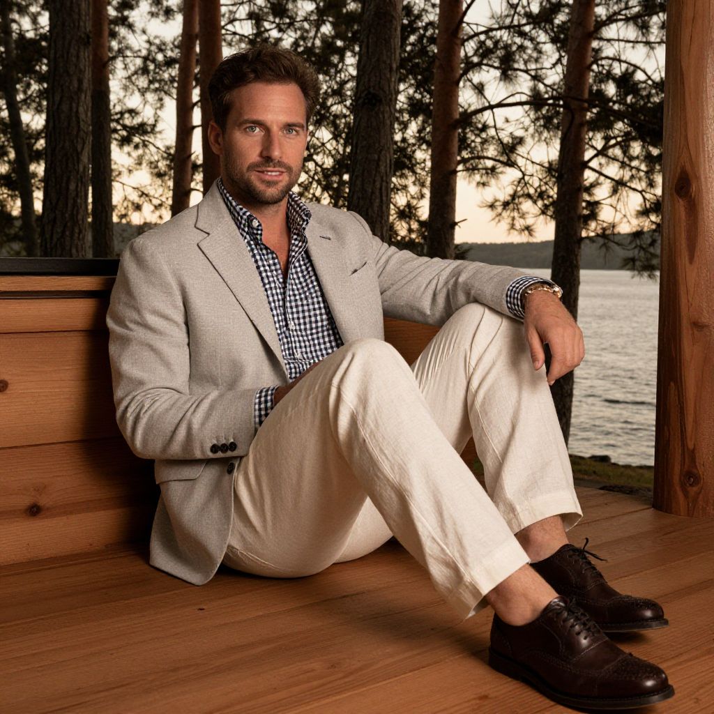 A man, light gray blazer, navy gingham shirt, cream linen pants, dark brown brogues, modern preppy vibe, cozy cabin, nestled in pine trees, lake view at sunset, sepia effect, relaxed smile.Man has masculine face and piercing eyes