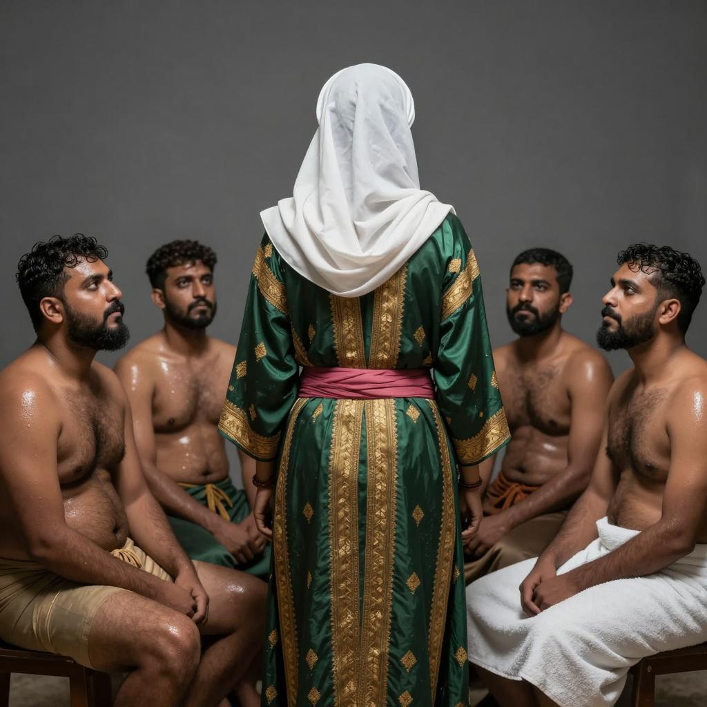 Six men in a dimly lit room. Central figure in white headscarf, green and gold patterned robe with pink sash, stands with back to camera. Five shirtless men with glistening skin sit around him, three on left and two on right. One man in white towel wraps sits on far right. Central figure's headscarf partially covers his face. Intense expressions on surrounding men. Gray walls in background.