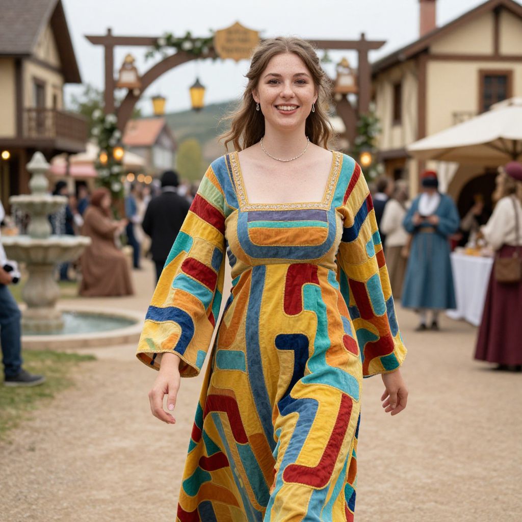 Photograph of a smiling young woman with fair skin and brown hair, wearing a vibrant, long-sleeved, square-neck dress featuring large, colorful geometric patterns in yellow, blue, red, and green. She stands in a rustic outdoor market with blurred people in the background, including men and women in period clothing. The market has wooden buildings, string lights, and a stone fountain. The path is gravel, and the sky is overcast. The woman wears a simple gold necklace and exudes a cheerful, confident demeanor. The image has a slightly vintage, fairytale-like quality.