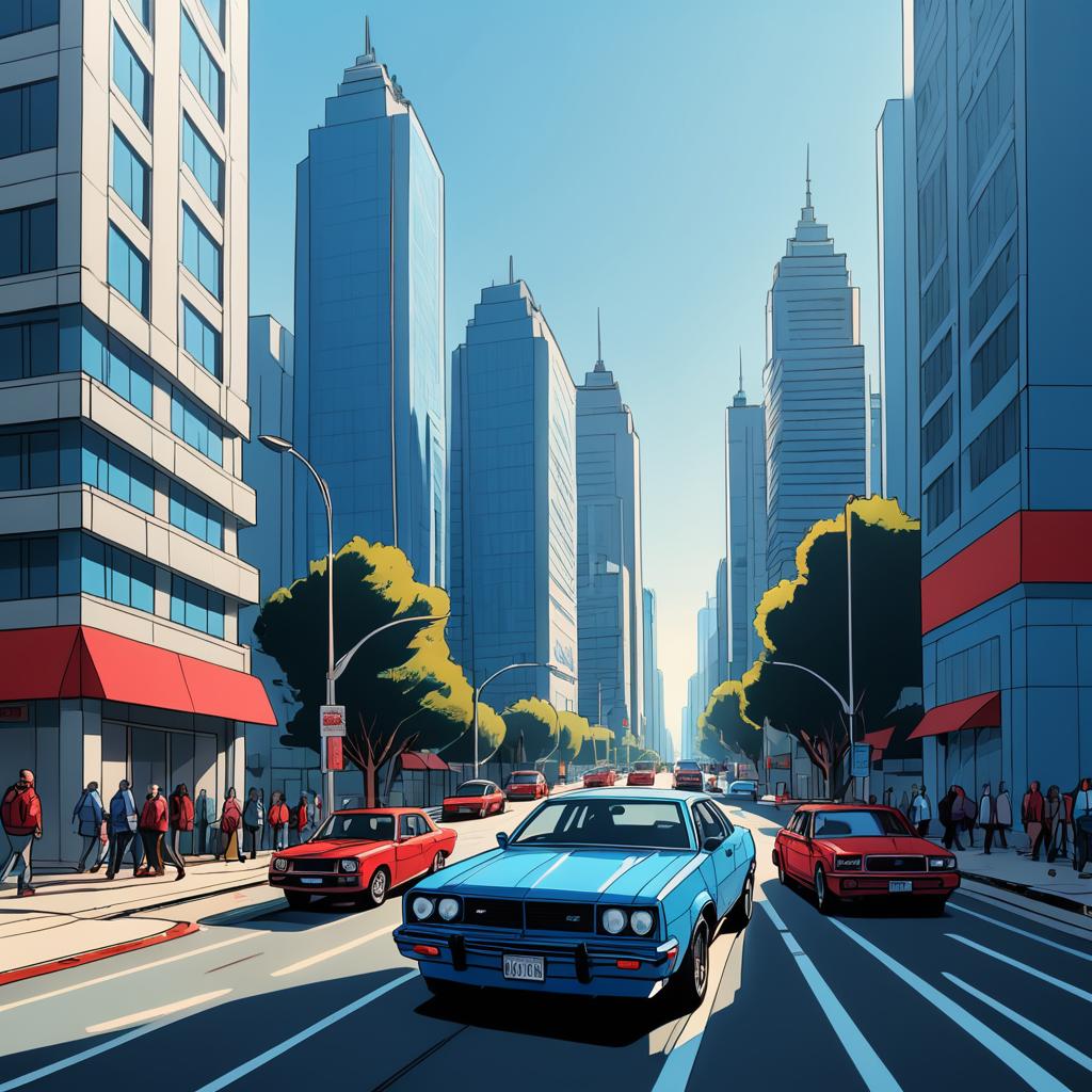 A busy city street with tall buildings on both sides, detailed urban scene with cars on the road including a prominent blue car, rendered in urban sketch style with comic book influences, bold line art, cel shading, high contrast lighting, vibrant blue and red color accents, late afternoon light casting shadows across the scene
