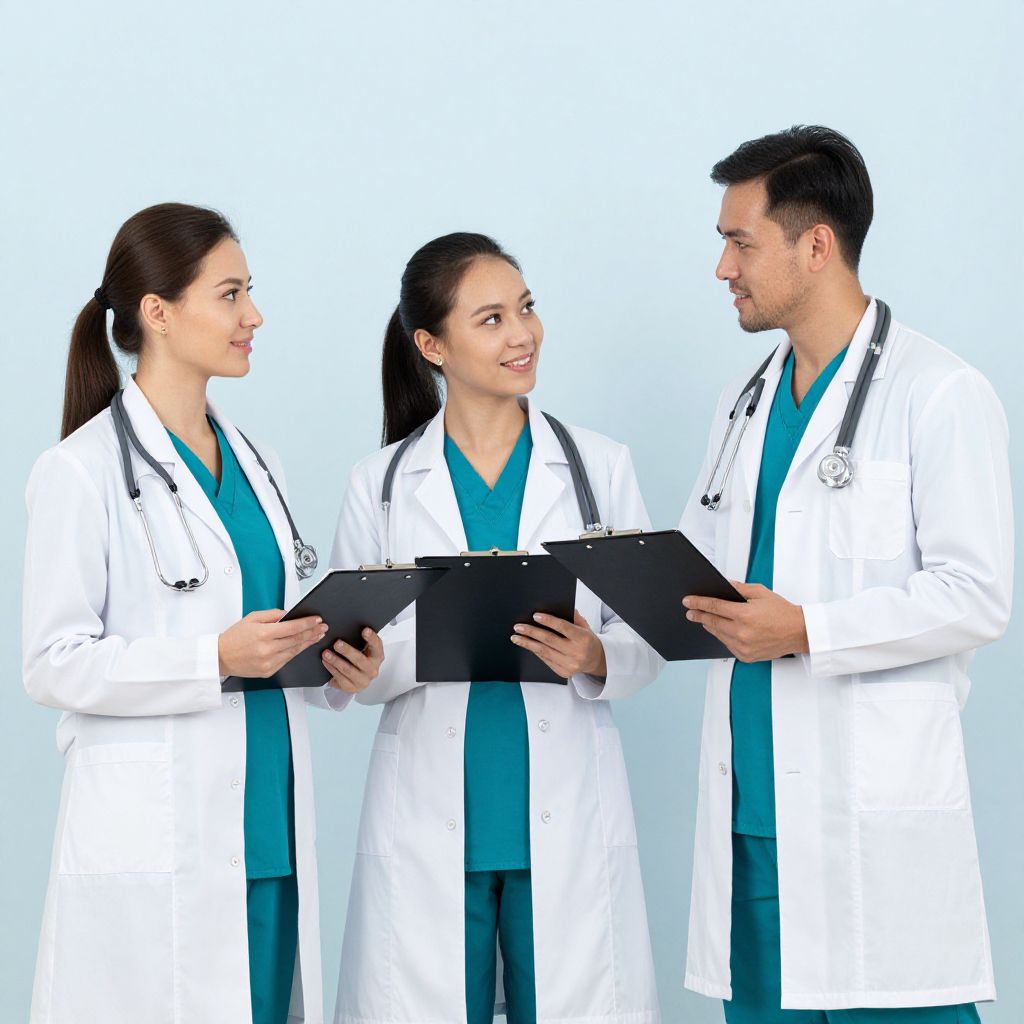 Three medical professionals—two women and one man—stand together in a light blue setting, each wearing white lab coats, teal scrubs, and stethoscopes, with two of them holding black clipboards while smiling and engaging in conversation.
