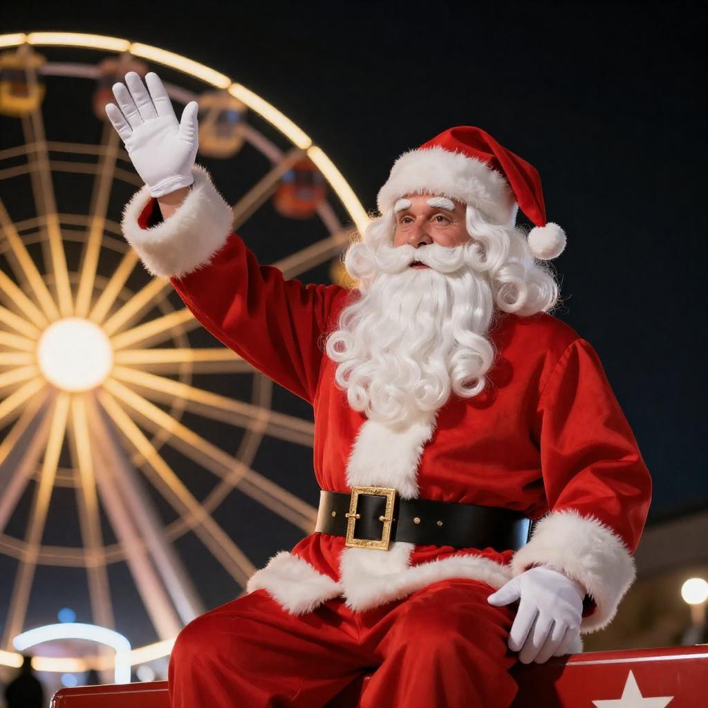 Photograph of a Santa Claus figure with a white beard and red suit with white fur trim, sitting on a black motorcycle. The background is dark with blurred trees and a yellow-black striped barrier. Santa's hands rest on the motorcycle's handlebars, and his legs are crossed. Bright light highlights his face and upper body.