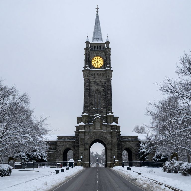 Photograph of a snow-covered, historic stone clock tower with a large, illuminated yellow clock face, standing centered in an arched gateway. The roadway, lined with black bollards, leads straight to the tower, flanked by snow-covered trees and bushes. The overcast sky is white with light gray clouds, enhancing the wintry atmosphere. The tower's dark stone contrasts with the bright snow, emphasizing its architectural details and symmetrical design. The background fades into a snowy, tree-lined horizon.