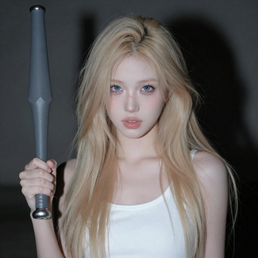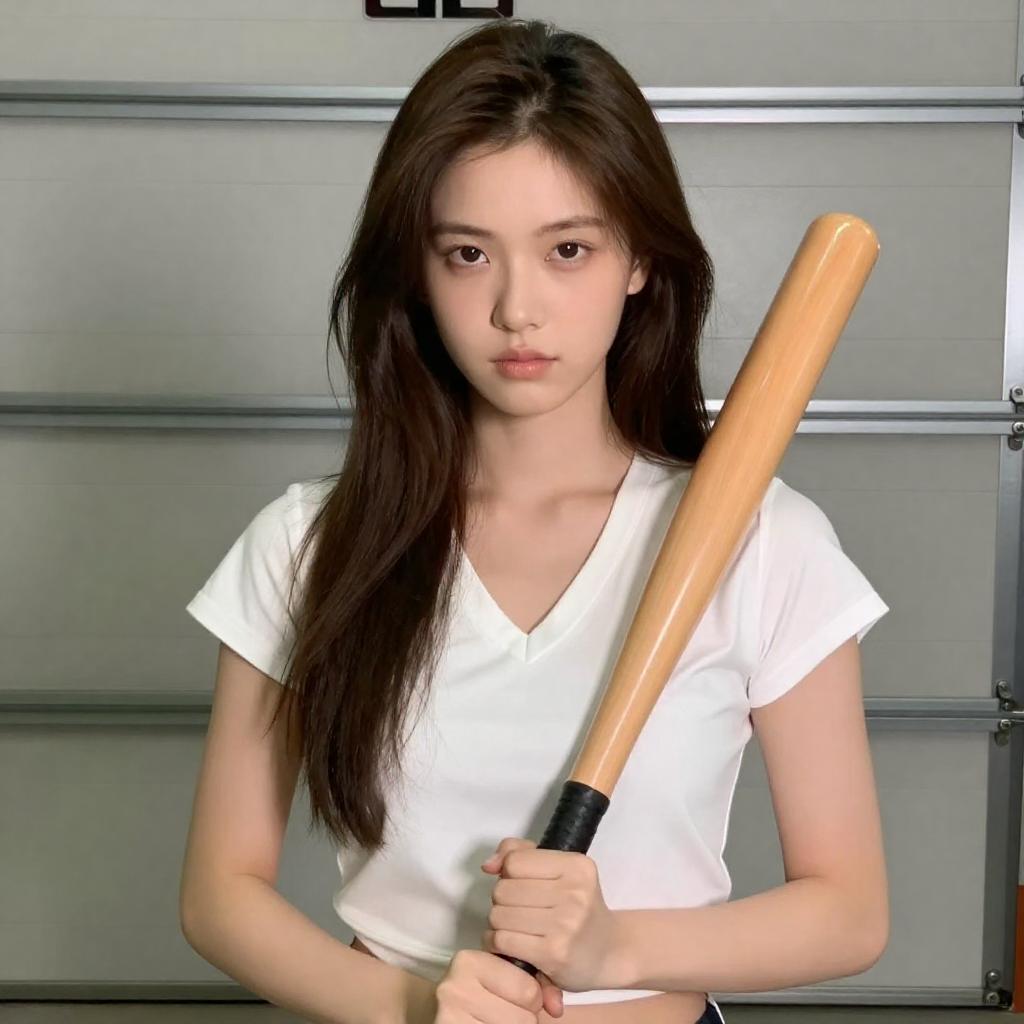Young woman with long, wavy brown hair, wearing a white, short-sleeved, V-neck blouse, holding a wooden baseball bat in both hands. She has a serious expression, standing in a garage with a metallic door in the background. She is centered in the image. Another person's arm is partially visible on the left.