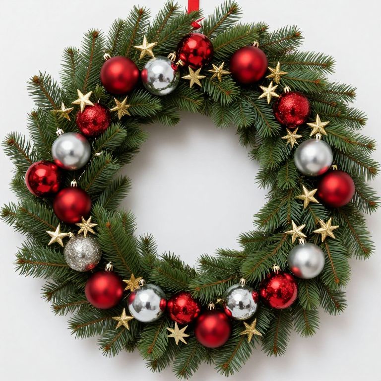 Circularly arranged evergreen branches form a festive Christmas wreath adorned with alternating clusters of shiny red and silver baubles, interspersed with small golden star decorations, creating a vibrant and whimsical holiday display.