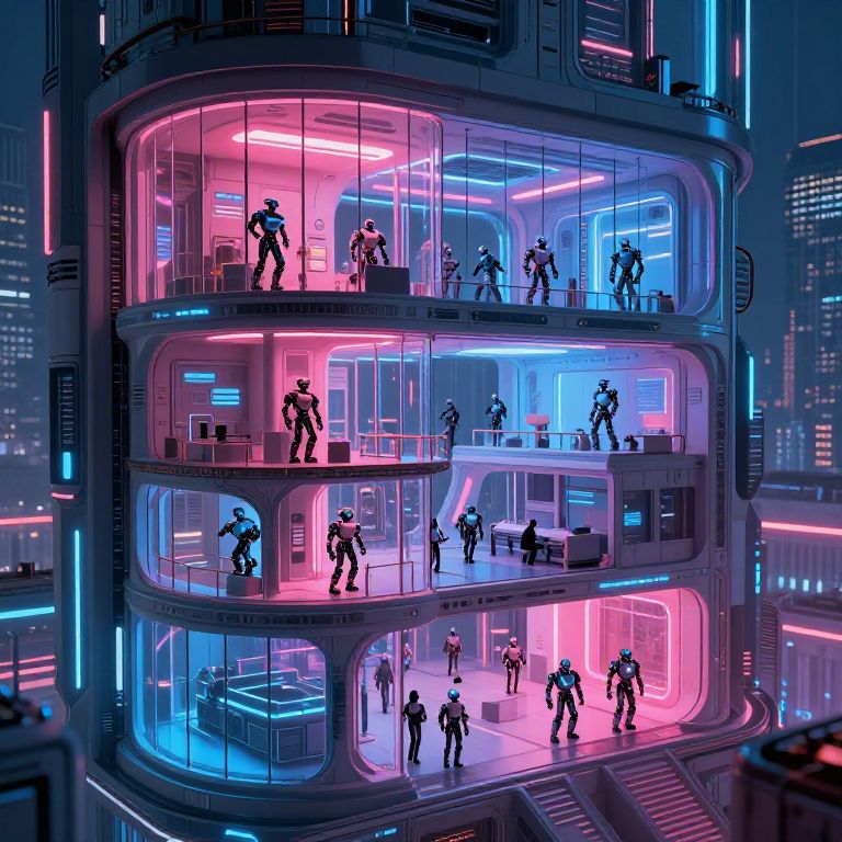 Interna of a futuristic city building, cutaway showing multi-level internal structures with bustling robotic inhabitants, neon lights, transparent glass walls, cyberpunk aesthetic with vibrant pink and blue hues, intricate architectural details