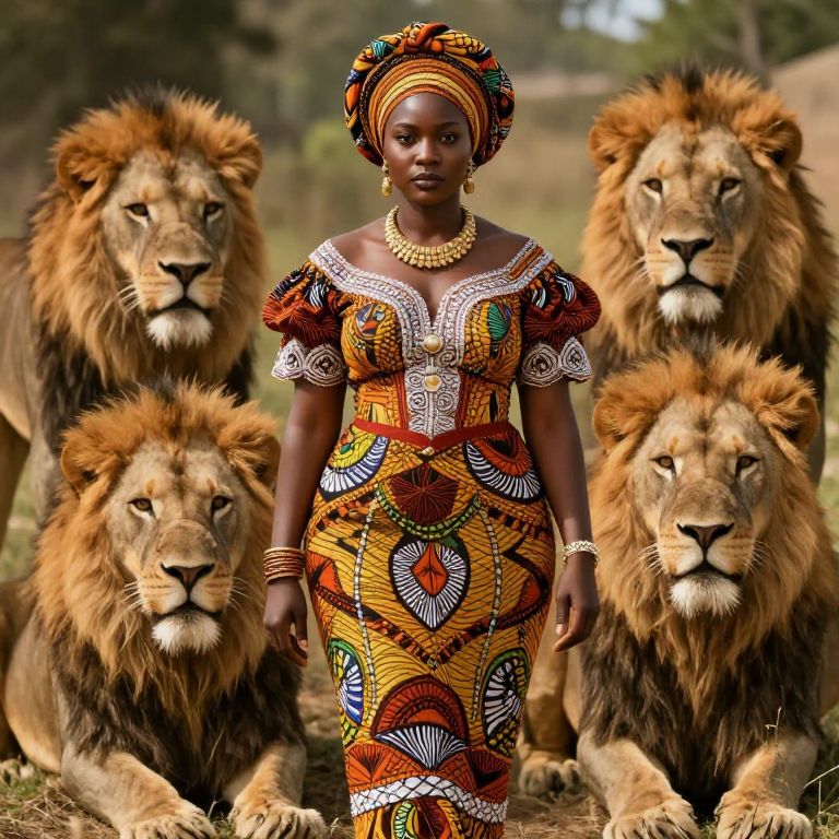 "Highlight cinematic style photography, African Yoruba goddess surrounded by lions, realistic effects,"