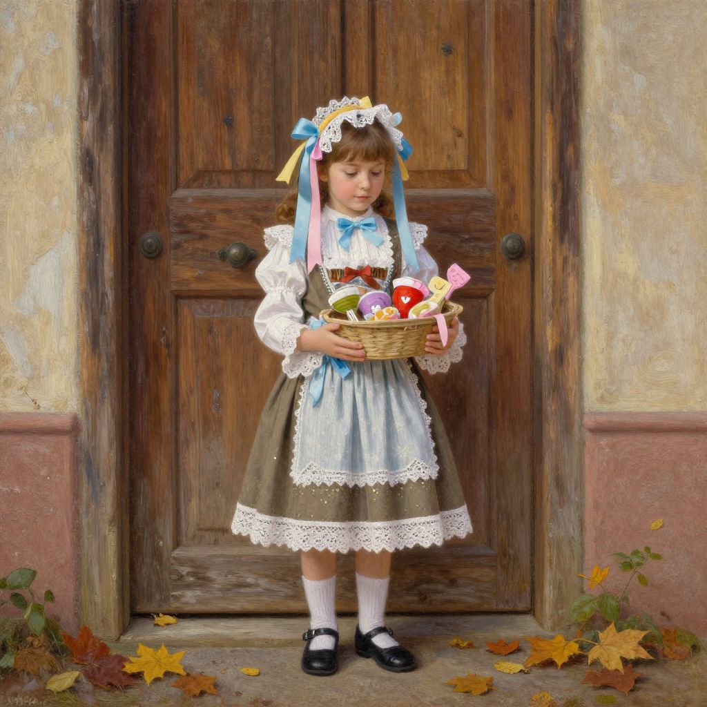Vintage style Schultuete standing by a rustic wooden door, adorned with lace and pastel color ribbons, filled with traditional German sweets and small toys, autumn leaves around, nostalgic mood, painterly texture, oil painting