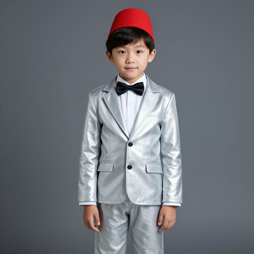 Photograph of a young Asian boy with short black hair, wearing a shiny silver suit, black bow tie, and bright red hat, standing against a