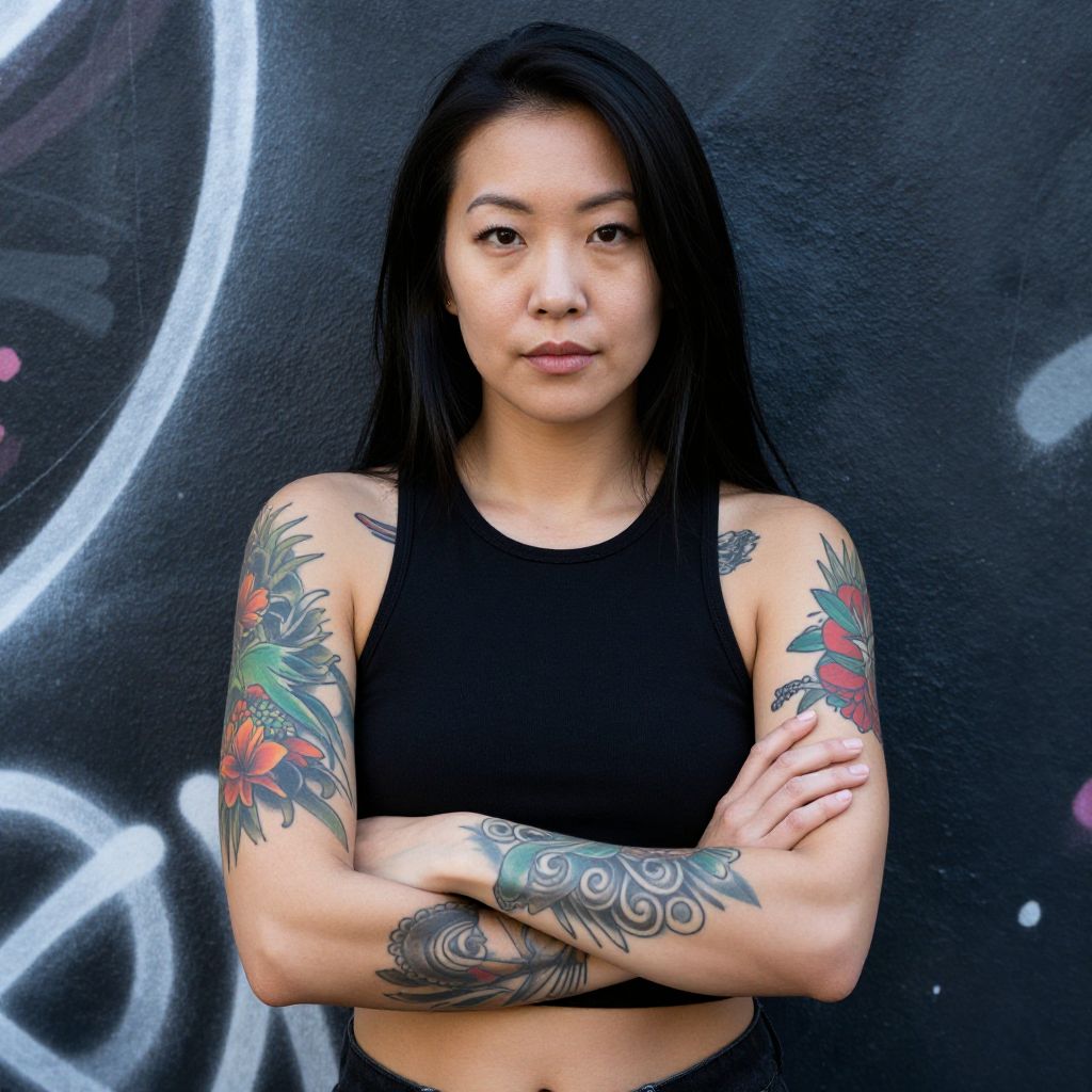Photograph of an Asian woman with long black hair, standing against a dark, graffiti-covered wall. She's wearing a black crop top, exposing her midriff, and has full-sleeve tattoos on both arms featuring colorful designs. Her arms are crossed over her chest, and she has a neutral expression on her face. The lighting is natural, highlighting her tattoos and facial features.