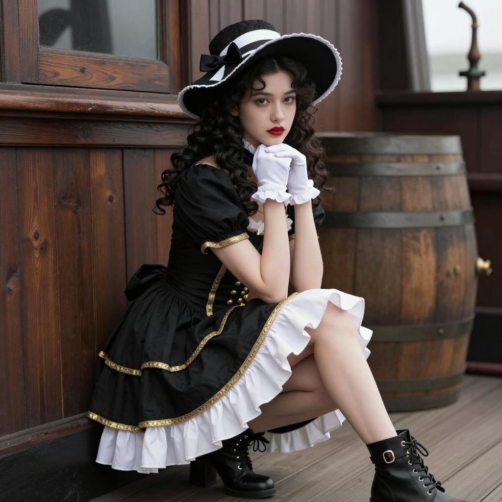 Young woman with pale skin, dark curly hair, and red lips. Wears black Victorian-style dress with gold trim, white ruffled underskirt, black boots with gold buckles, white gloves, and black hat with white accents. Leans against wooden ship wall. Barrel and pipes in background. Hands clasped under chin, right leg slightly bent. Intense expression. Photorealistic style.