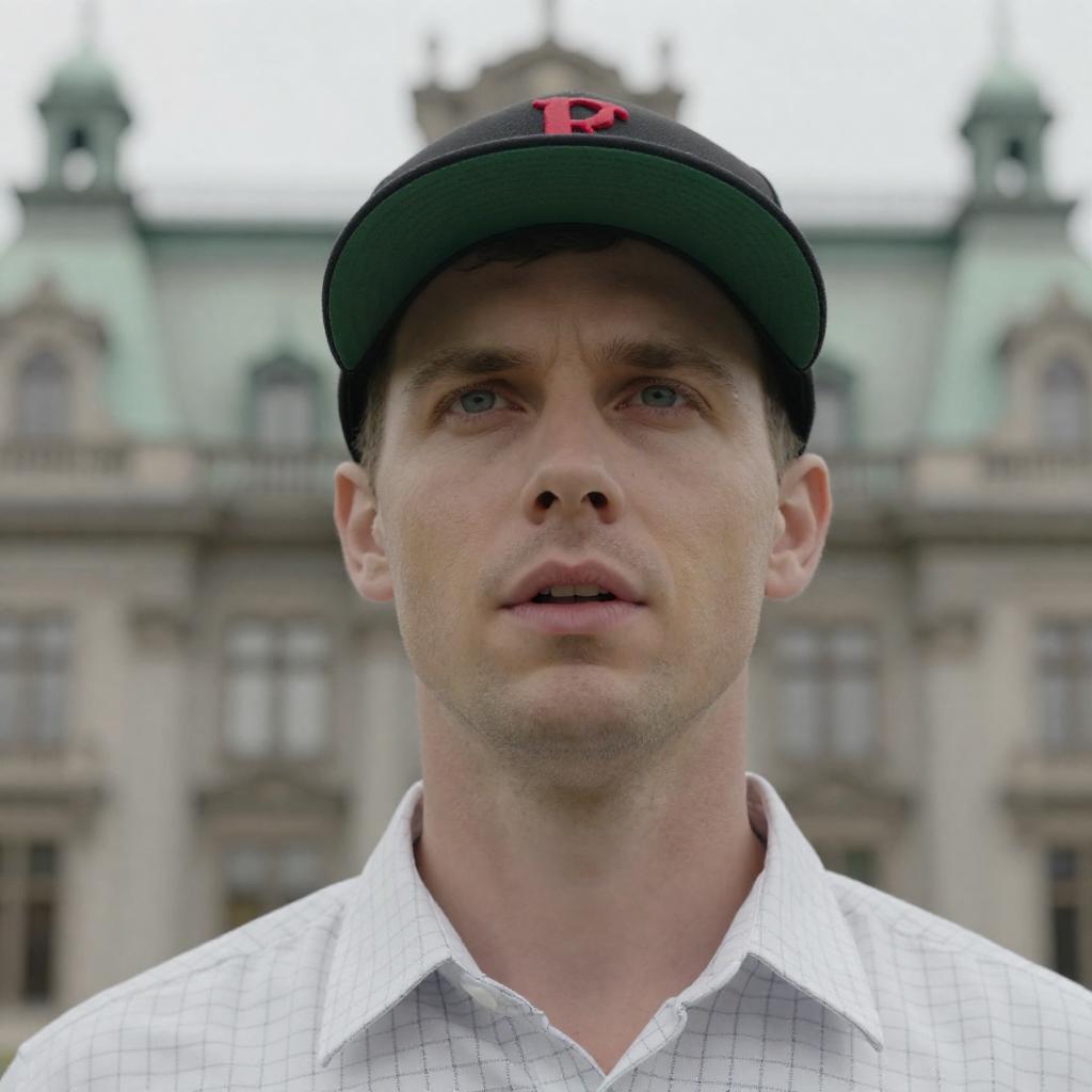 Photograph of a man with short brown hair, light skin, blue eyes, wearing a black and green baseball cap with a red , and a white checkered shirt. He looks upward with a slightly open mouth. In the background, an ornate building with green-tinted roofs and decorative spires. The man is centered, and the building is slightly blurred in the background.