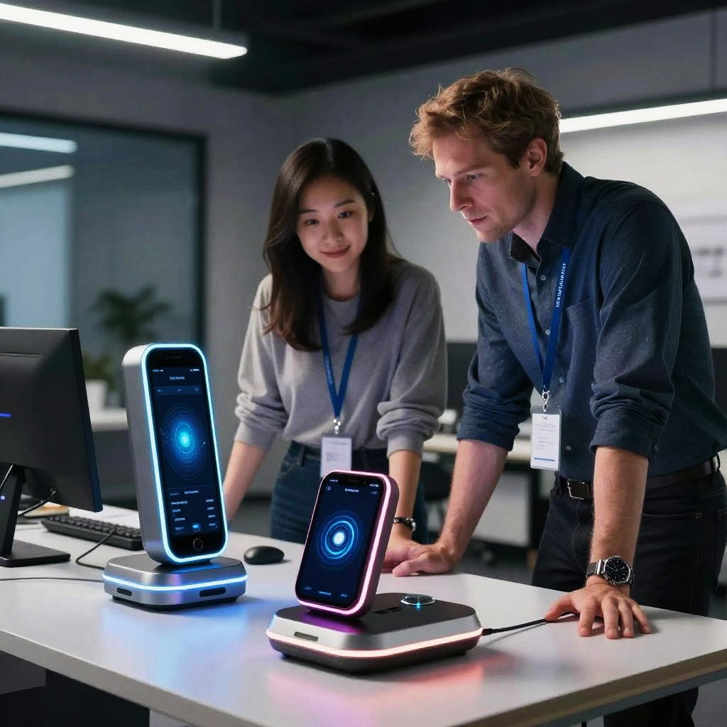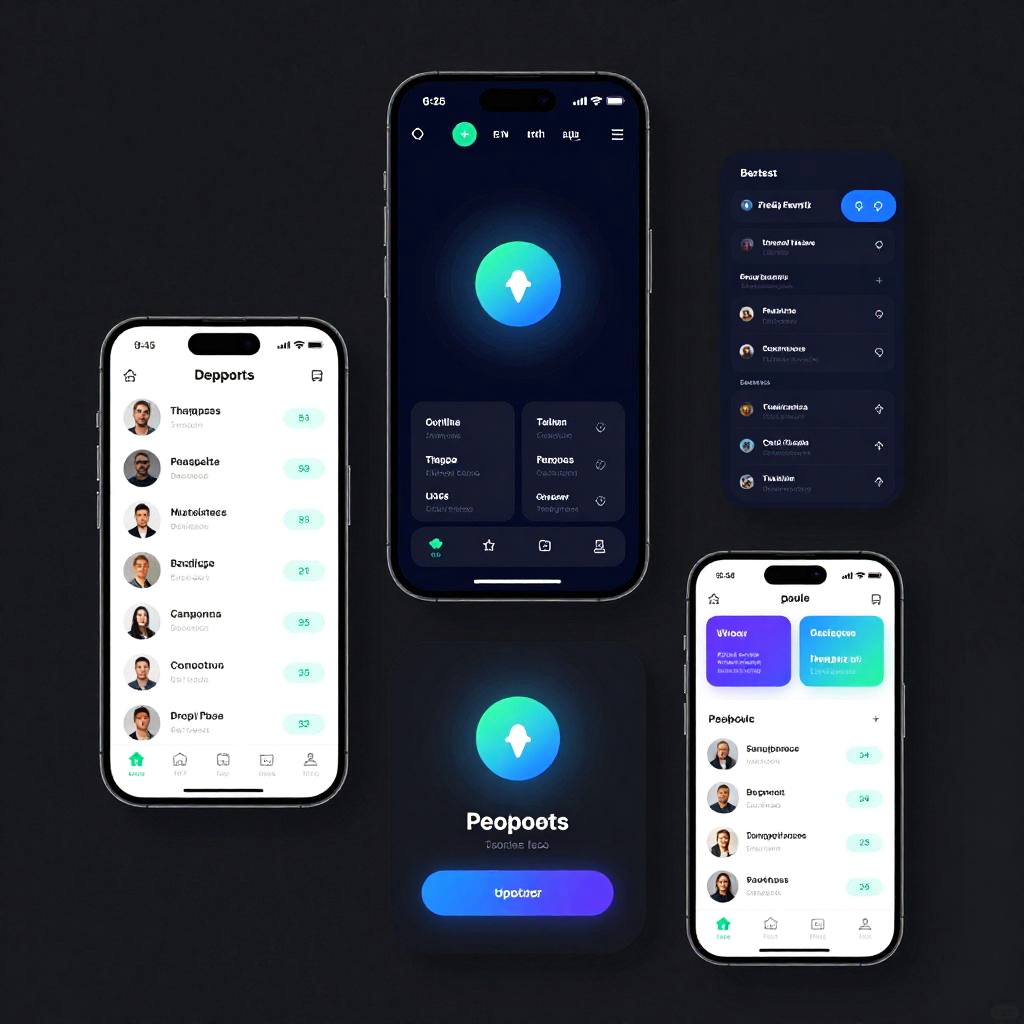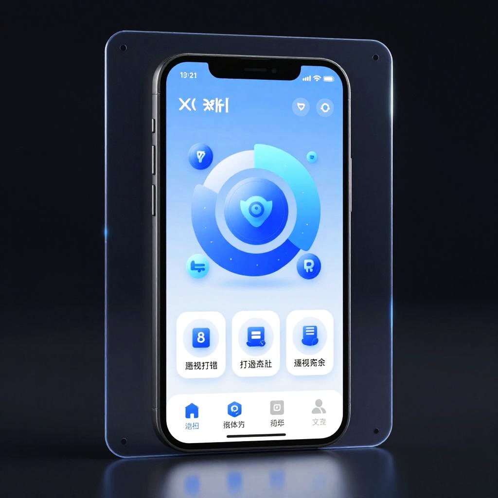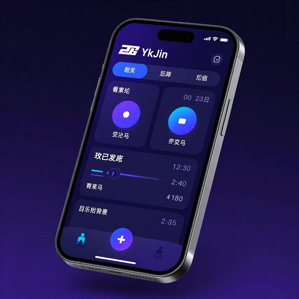 Ykj app displayed on a transparent holographic screen, ambient dark background with light streaks, cyberpunk aesthetic, detailed icons and smooth animations, ultra-modern user experience design