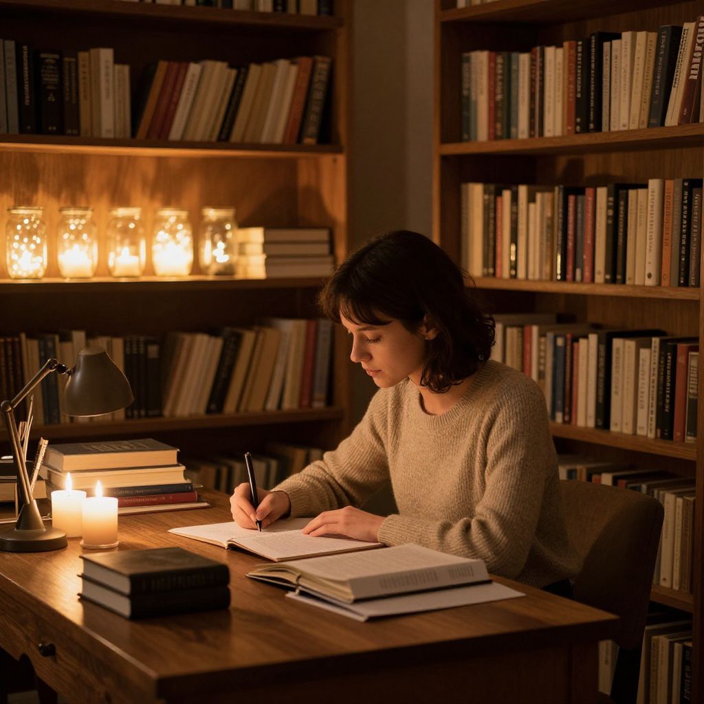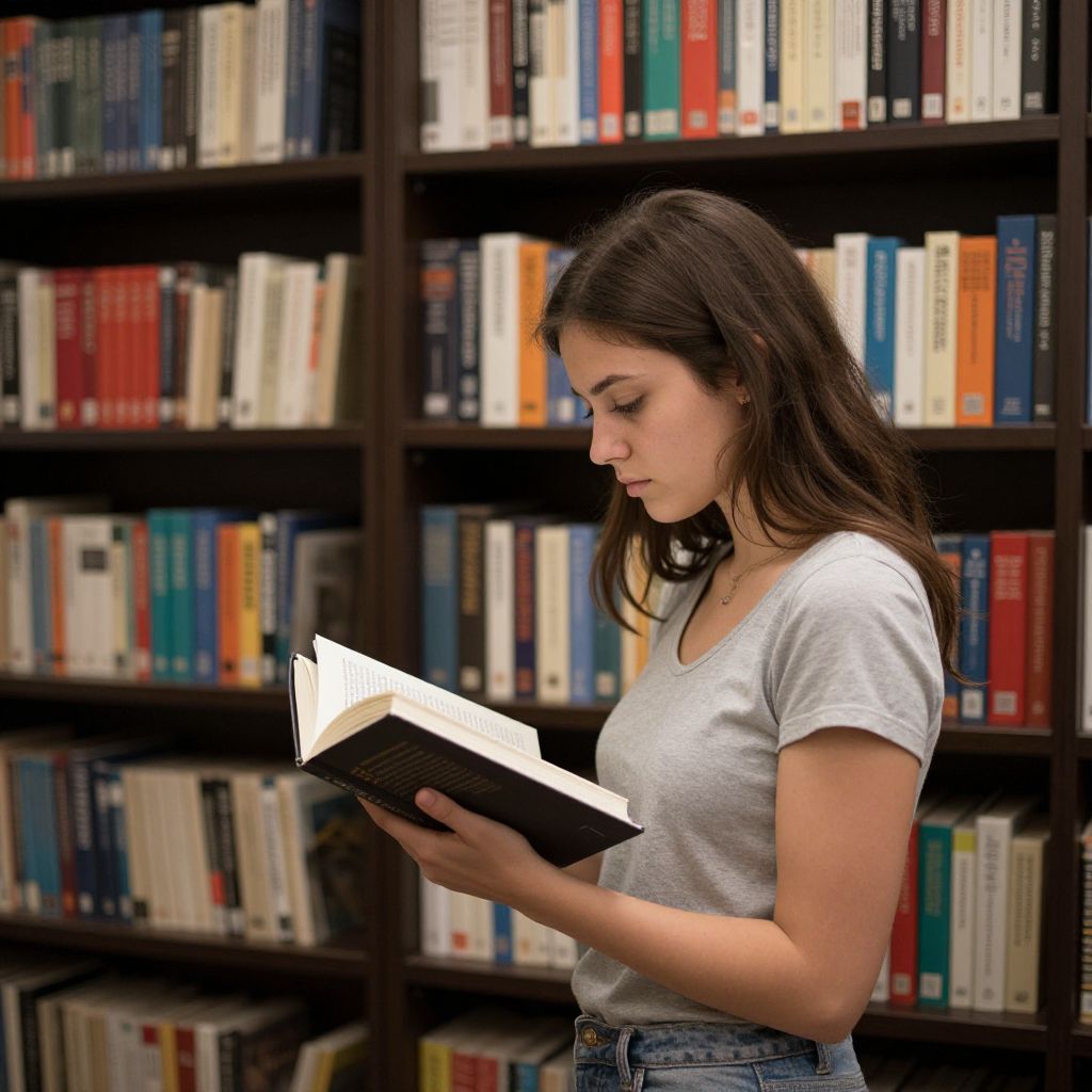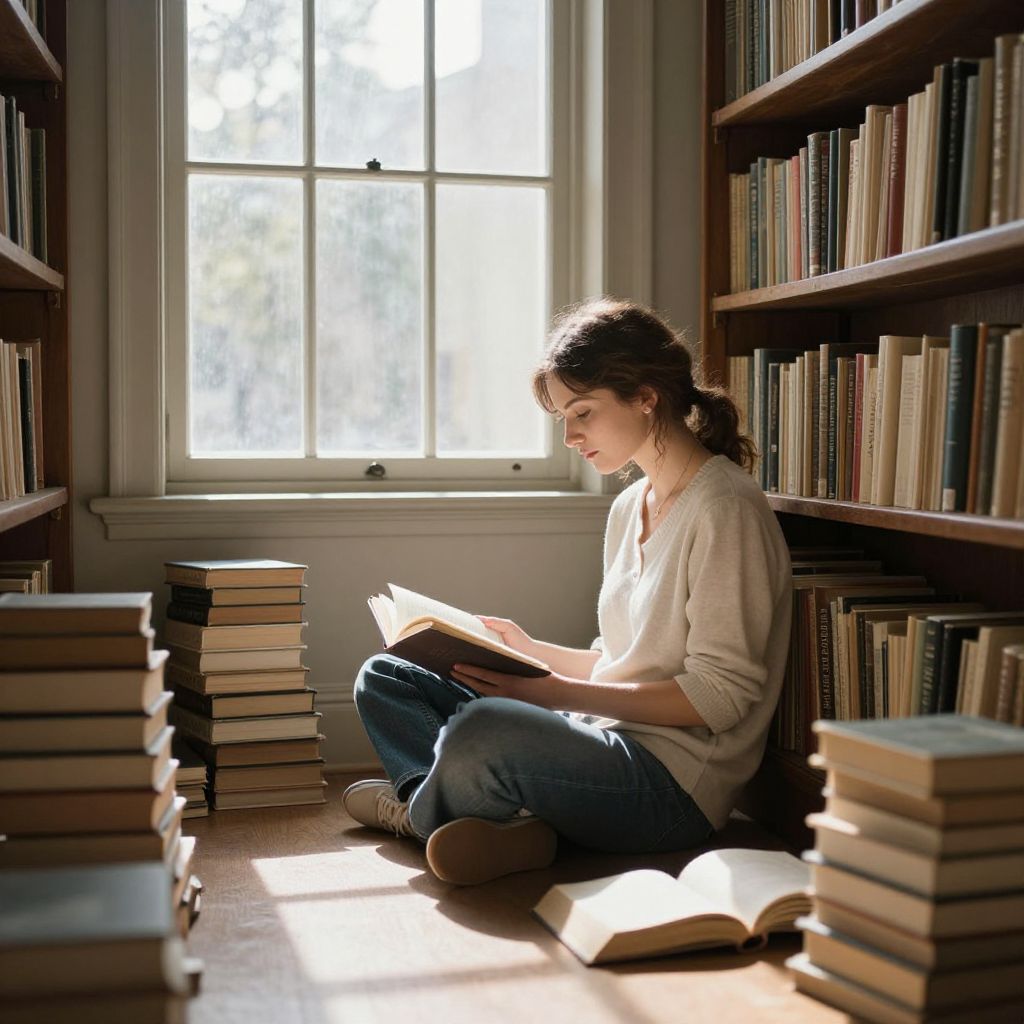 A woman engrossed in reading an open book sits at a wooden desk in a dimly lit library, surrounded by tall shelves filled with countless leather-bound volumes, while sunlight streams through an arched window revealing a lush green landscape outside.