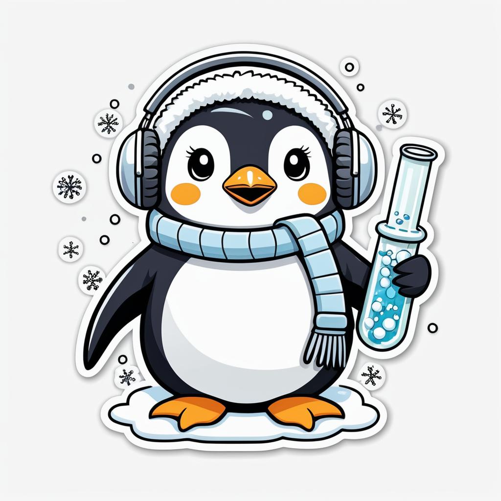 Little penguin in a ear muffs holding a test tube, Kawaii Style, die cut sticker, no text, 2d art style sticker, vector style, clean lines on a snowy white background only, snowy white background