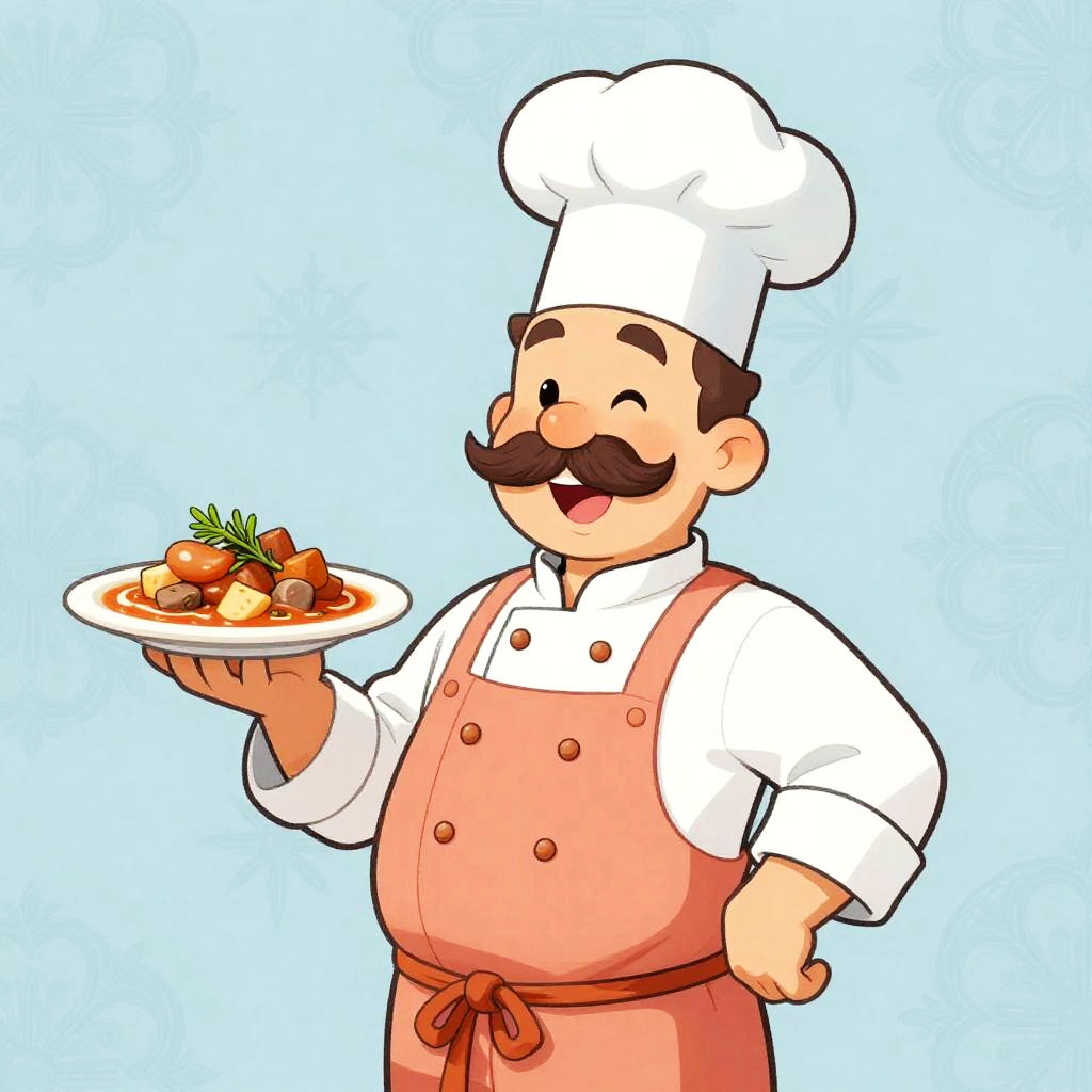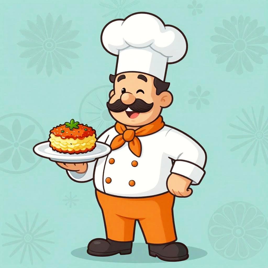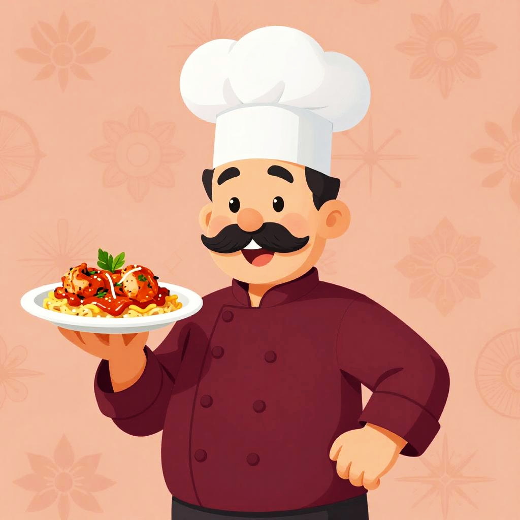 Cartoon illustration of a cheerful chef with a large mustache, wearing a traditional blue chef's uniform and tall chef hat. The chef stands confidently, holding a plate with a freshly prepared sushi platter garnished with herbs. Background features a subtle decorative pattern in a soft beige, creating a friendly and inviting atmosphere.