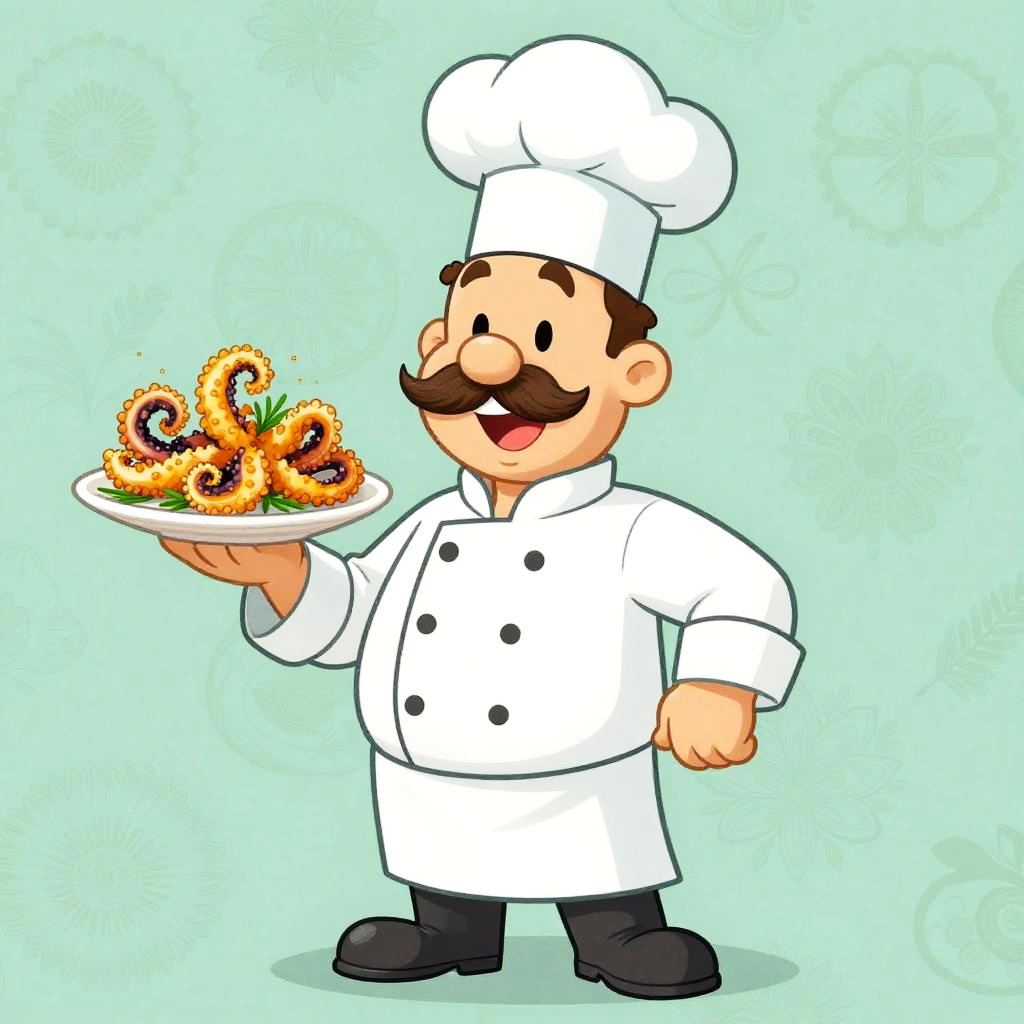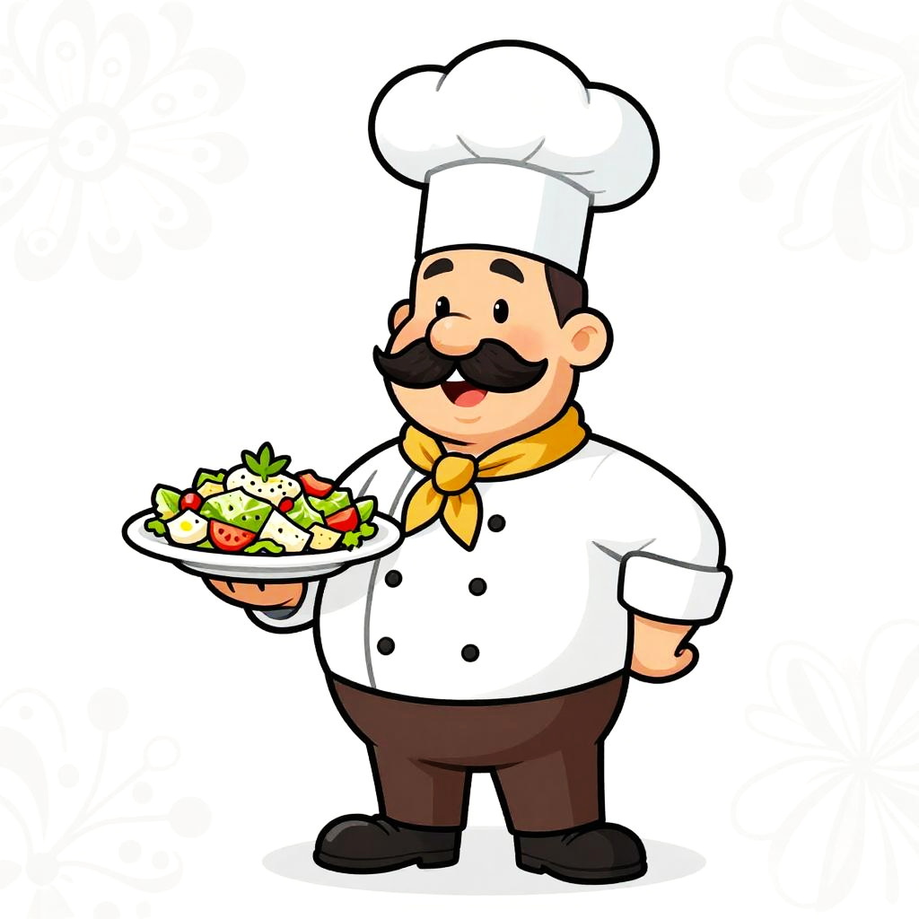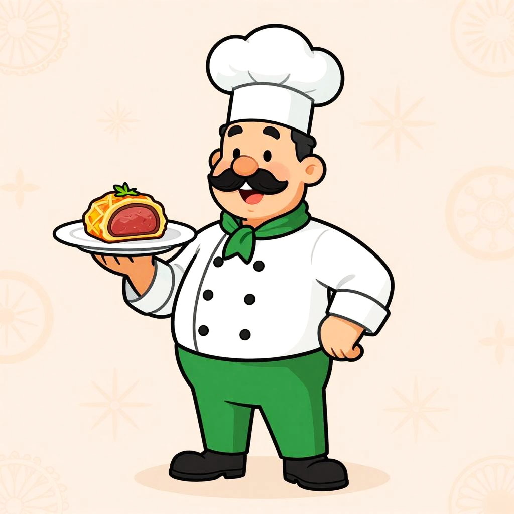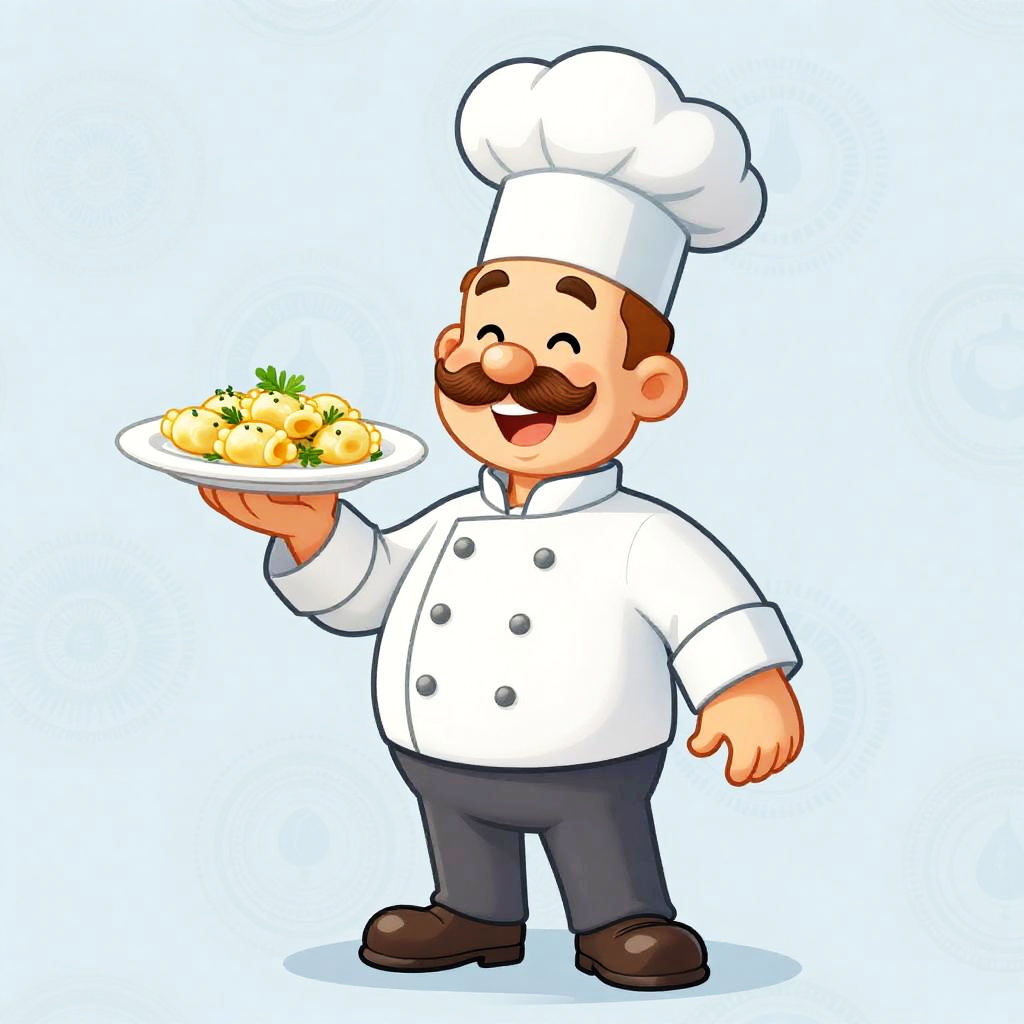 Cartoon illustration of a cheerful chef with a large mustache, wearing a traditional blue chef's uniform and tall chef hat. The chef stands confidently, holding a plate with a freshly prepared sushi platter garnished with herbs. Background features a subtle decorative pattern in a soft beige, creating a friendly and inviting atmosphere.
