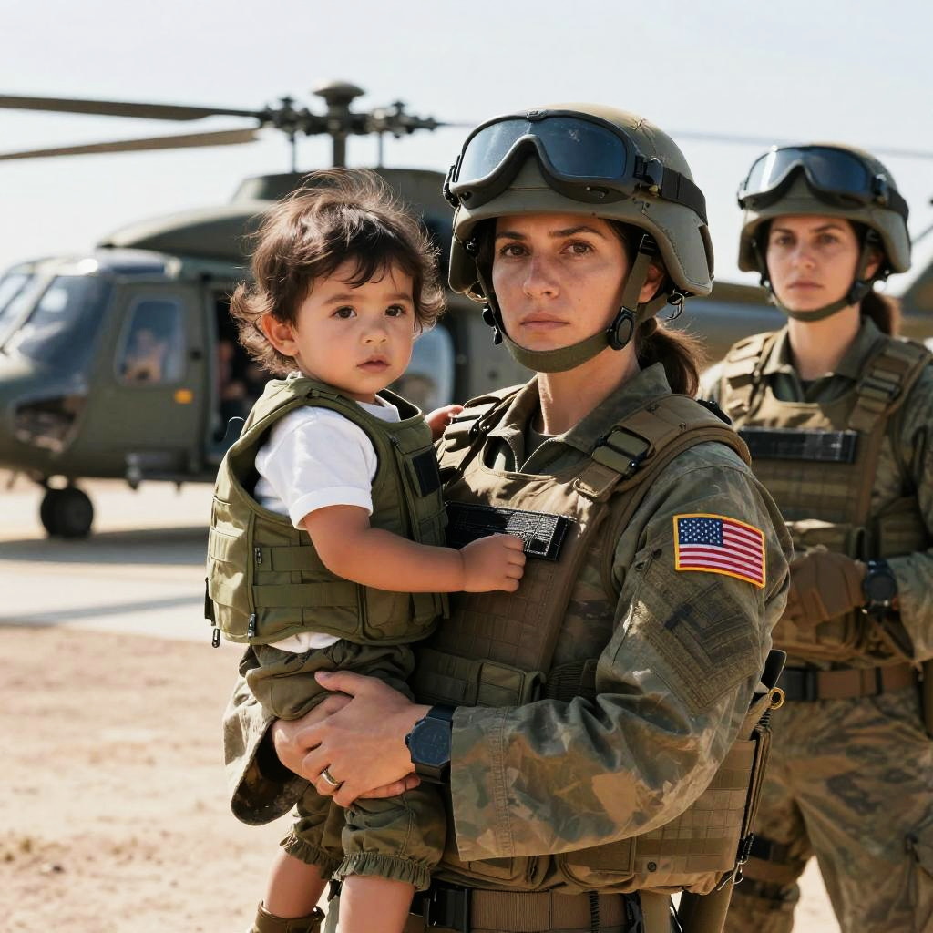 Photograph of a serious-looking woman in military gear, holding a curious toddler with dark hair in a green vest and white shirt. She wears a helmet with goggles and an American flag patch on her sleeve. A second woman in similar gear stands behind them, with two military helicopters blurred in the background. The scene is lit by bright sunlight, highlighting the dry, sandy ground.