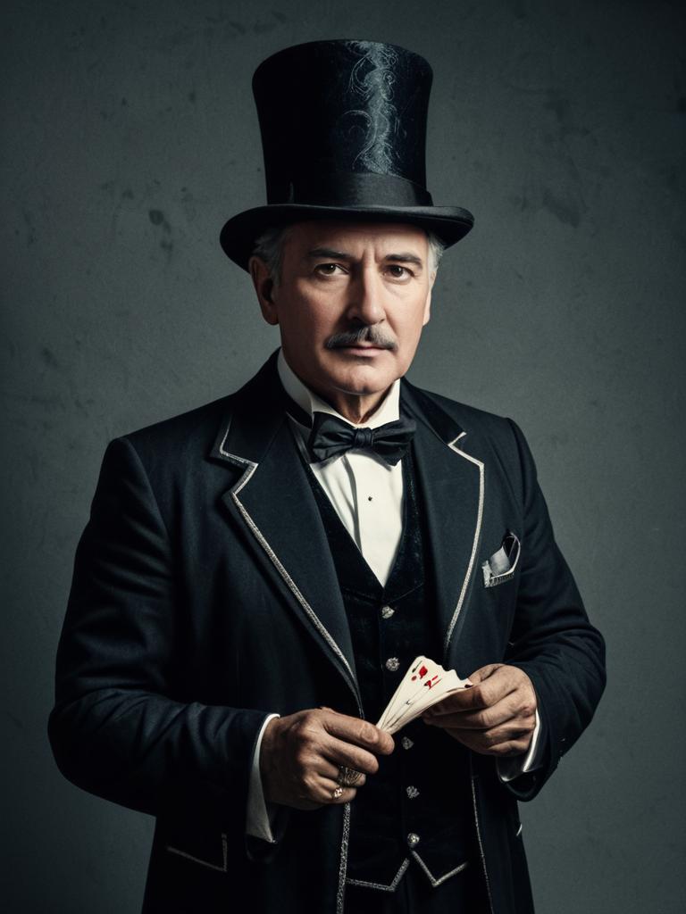 Photorealistic studio portrait of a middle-aged man wearing a traditional magician costume consisting of a tall black top hat, black coat with gold trim, matching vest, white shirt, and red bow tie. The man is performing a magic trick, appearing to levitate a playing card between his fingers against a plain brown background.