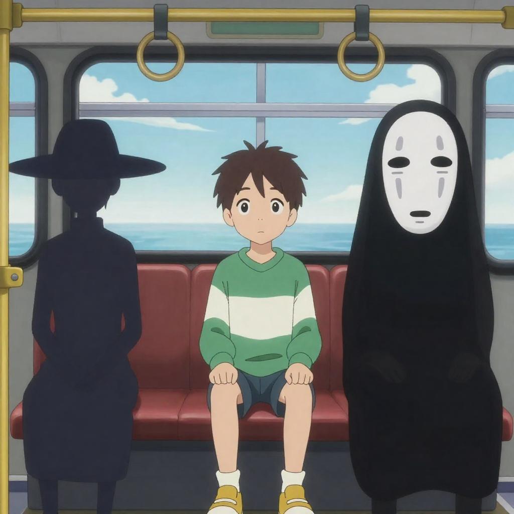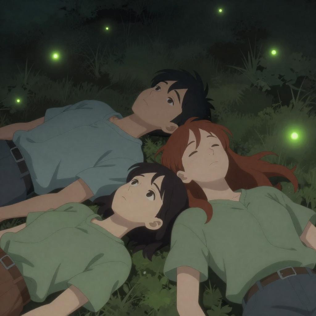 Anime-style illustration featuring a young boy with brown hair wearing a green cap, white t-shirt, blue rolled-up pants, and brown shoes standing on a small platform. A girl with brown braided hair dressed in a blue dress and brown shoes is flying serenely in the dark night sky with a glowing crescent light behind her. The background is dark blue with subtle clouds.