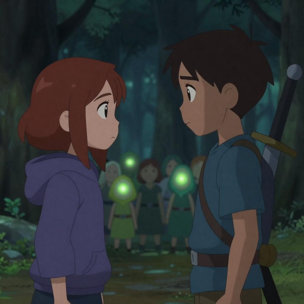 Anime-style illustration. Young boy with brown hair, green cap, white shirt, blue pants, and brown shoes, standing on a small platform with a large circular structure. Girl with brown braided hair, blue dress, and brown shoes, flying in the night sky with glowing light behind her. Dark blue, cloudy background. Boy's expression is focused, girl's expression is serene.