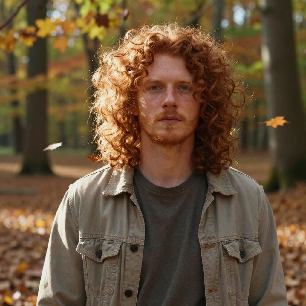 Red curly hair men standing in a sunlit forest clearing, vibrant natural light highlighting the rich texture of their hair, wearing casual rustic clothing, soft focus background with autumn leaves falling, realistic detailed portrait style.