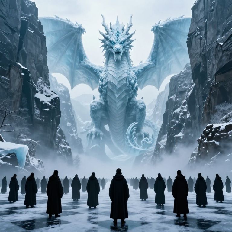 A colossal ice dragon looms above a vast valley, its menacing form suspended between towering cliffs as a procession of robed figures stands solemnly on a checkerboard-patterned ground, their silhouettes mirroring the frozen stillness of the scene.