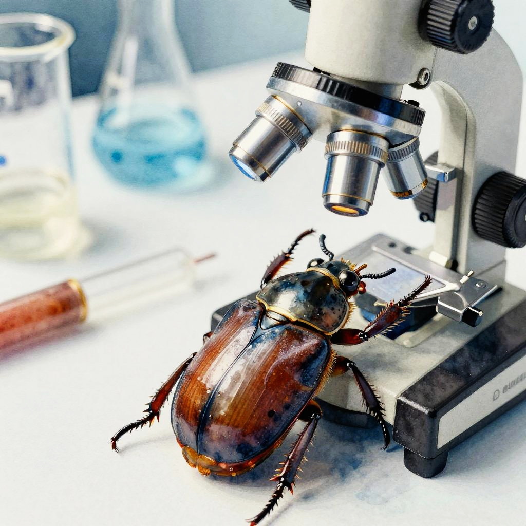 Beetle under a microscope, extreme close-up showing delicate leg joints and fine surface patterns, fluorescent lighting enhancing natural colors and shadows, 3D render style with scientific accuracy and creative composition capturing a naturalistic study.