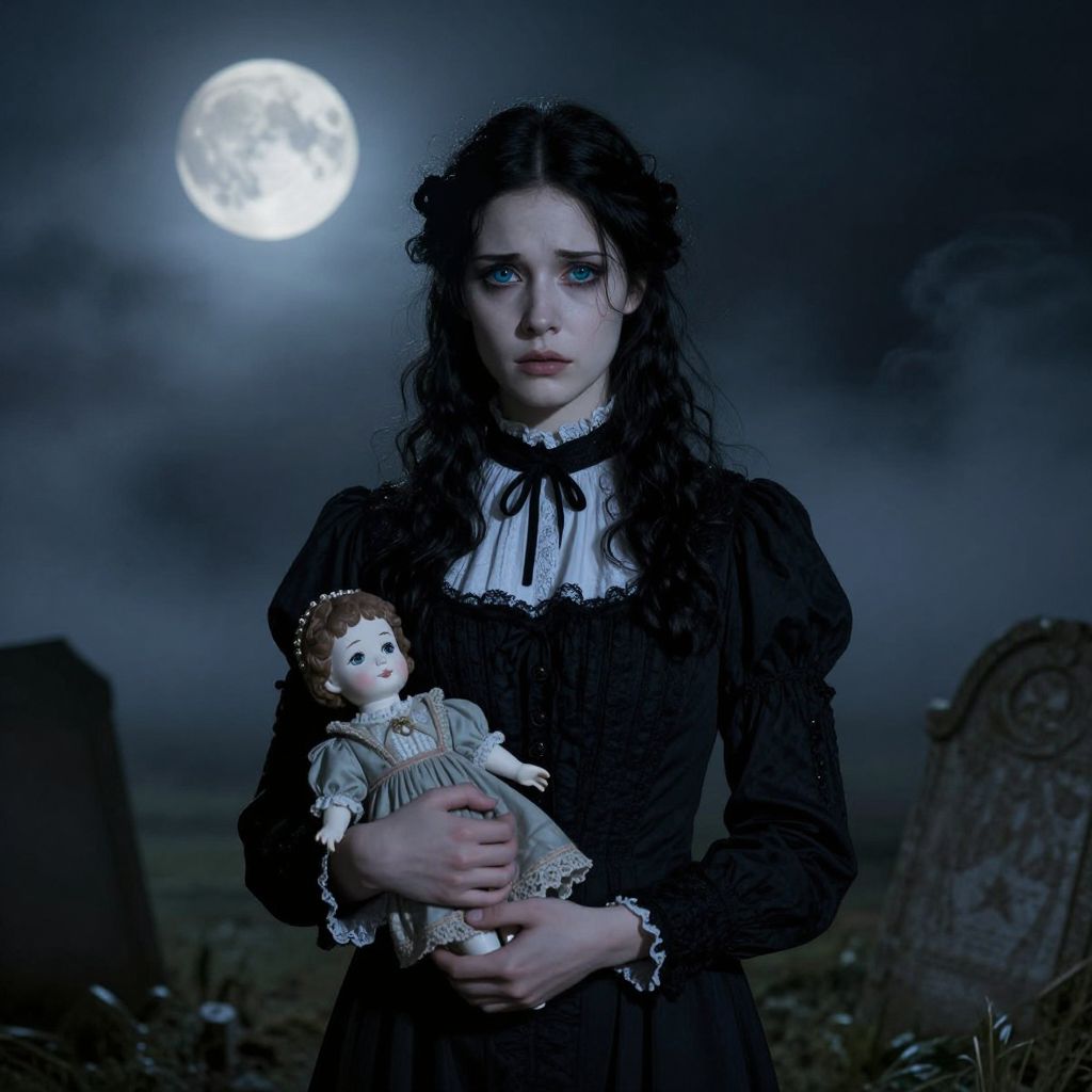 A somber portrait in a haunting style reminiscent of Edward Gorey, this image features a young woman with flawless alabaster skin and ebony tresses dressed in the refined attire of Victorian mourning garb. She stands solitary amidst the swirling mists of a moonlit night, her ghostly visage illuminated by the ethereal glow of a full moon casting dramatic shadows that play across her face, evoking a sense of mystery and unease. The woman's piercing sapphire eyes convey a complex blend of sorrow and defiance as she holds close a delicate porcelain doll with an enigmatic smile, hinting at a dark secret hidden within the age-worn tombstones.